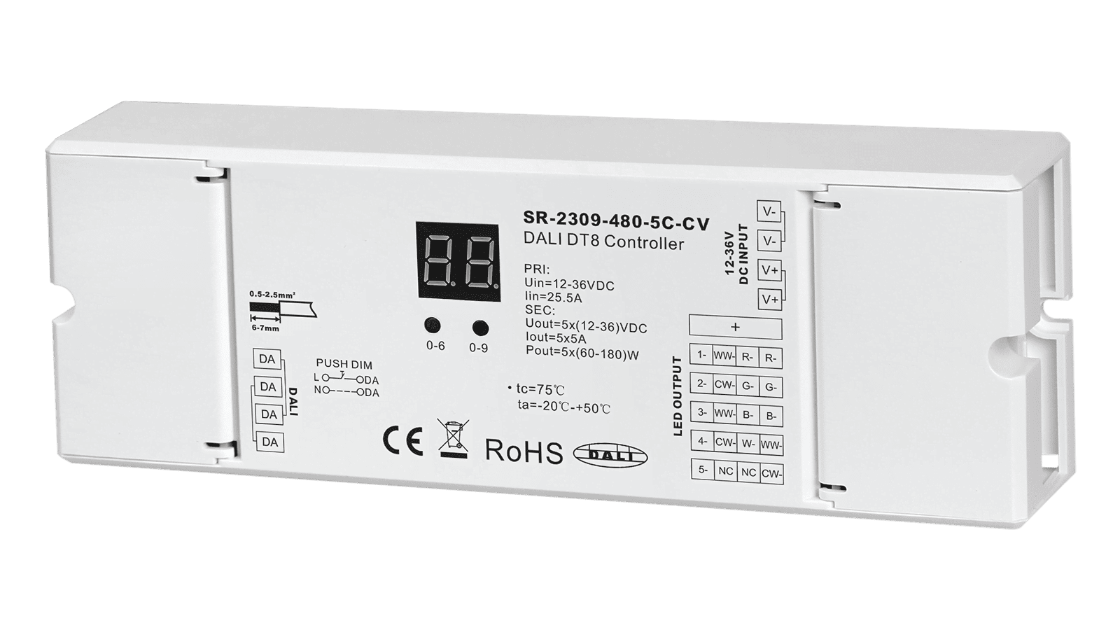 SR-2309-480-5C-CV ist ein 7 in 1 DALI DT8 Dimmer, ideal für den Betrieb von TW oder RGBW Konstantspannungs LED Anwendungen wie z.B. LED Streifen geeignet. 7 verschiedene DT8 Farbtypen (Tc, RGBWAF, XY, 2*Tc, XY+Tc, RGB+Tc, XY+W(DT6)) einstellbar.