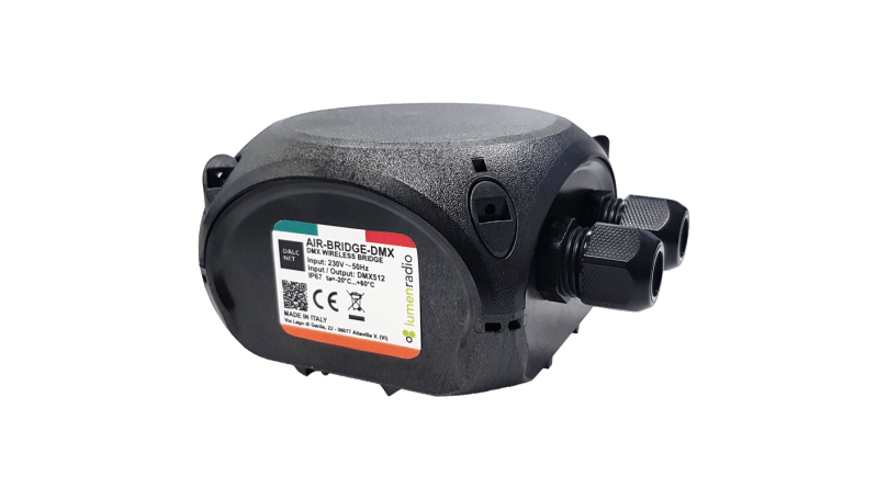 AIR-BRIDGE-DMX ist ein drahtloser Sender und Empfänger, der von einem LumenRadio-Modul mit gleichzeitigem Bluetooth betrieben wird und das DMX-Protokoll in ein drahtloses Signal umwandelt. Concurrent Bluetooth ermöglicht eine einfache Einrichtung, Konfiguration und Lichtsteuerung mit tragbaren Geräten über die mobile Anwendung LumenRadio CRMX Toolbox©.