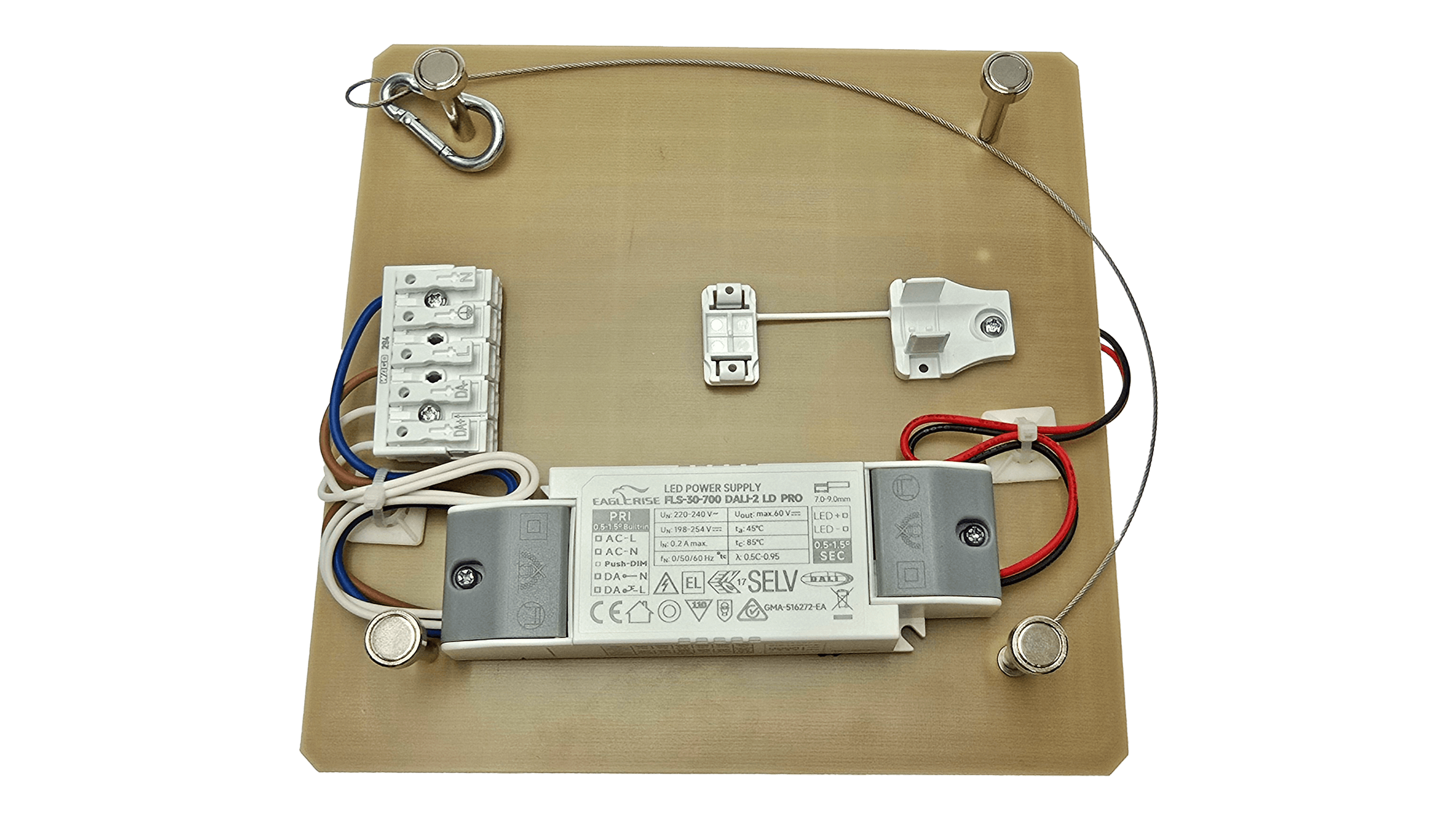 Quadratischer LED Einsatz mit DALI Netzteil und Magneten für das schnelle Umrüsten bestehender konventioneller Leuchten auf LED