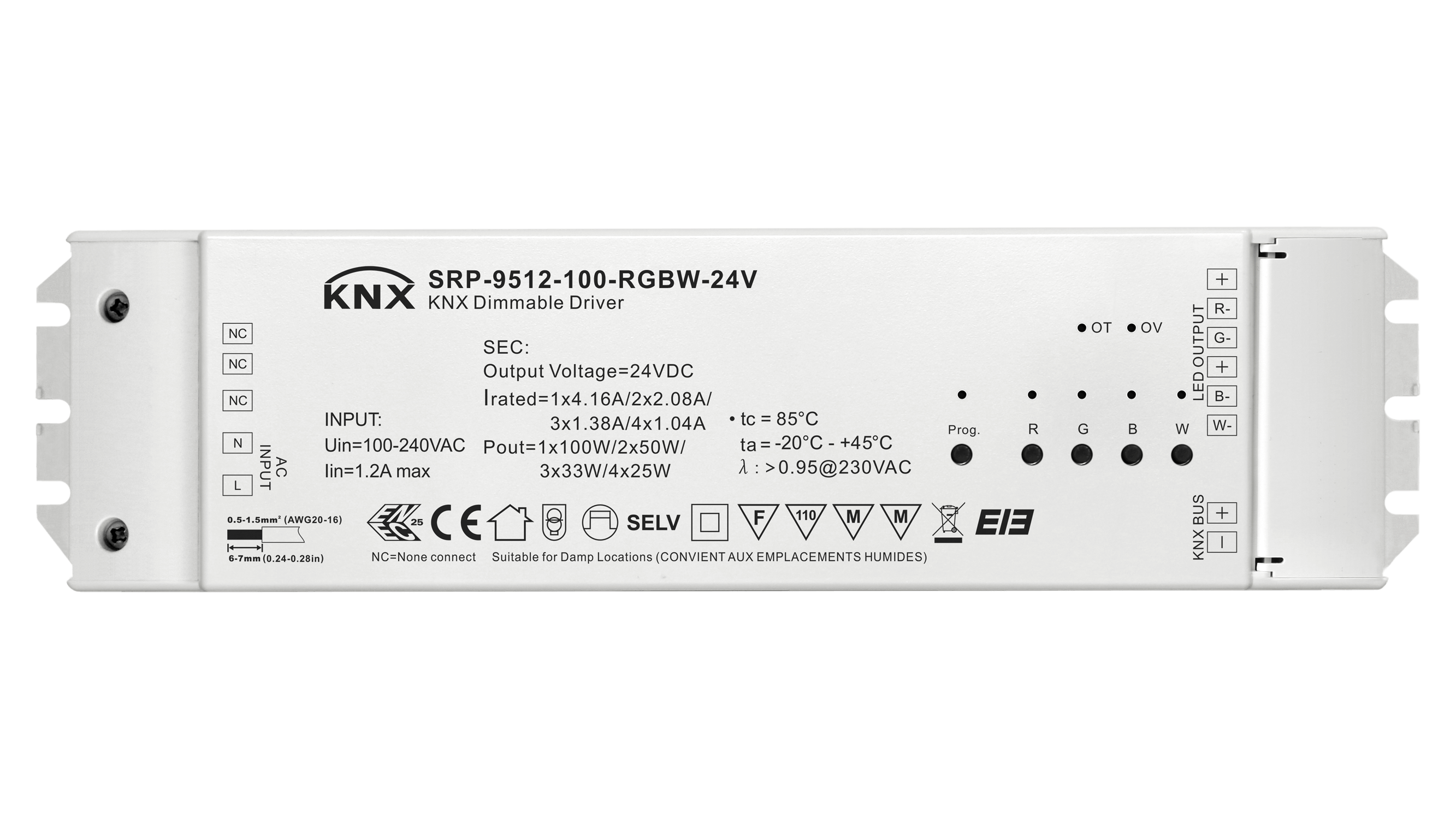 SRP-9512-100-RGBW-24V mit 4 Kanal PWM Ausgang und integrierter KNX Schnittstelle ist ideal für den Betrieb von Tunable White oder RGBW Konstantspannungs LED Anwendungen wie z.B. LED Streifen geeignet.