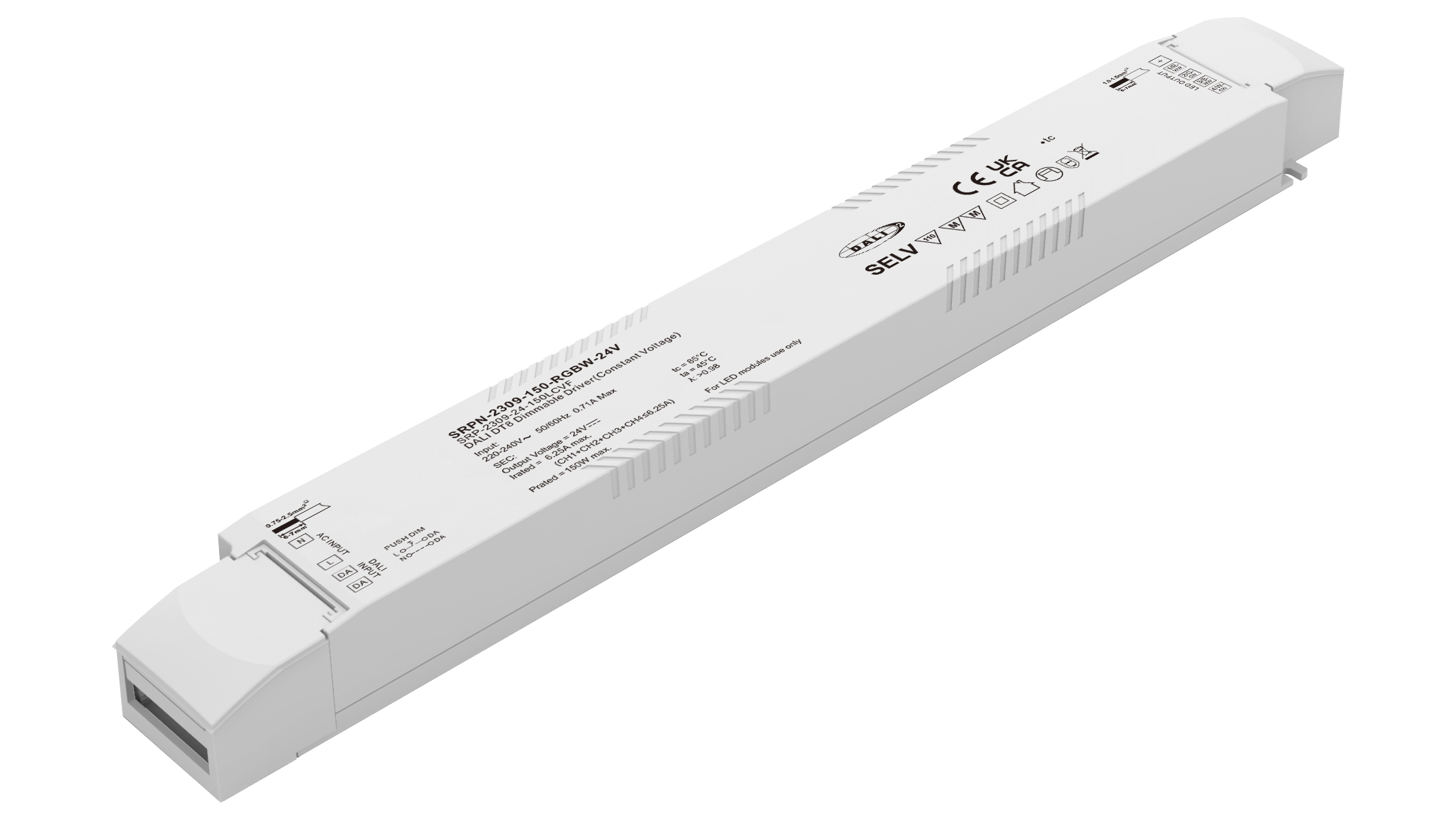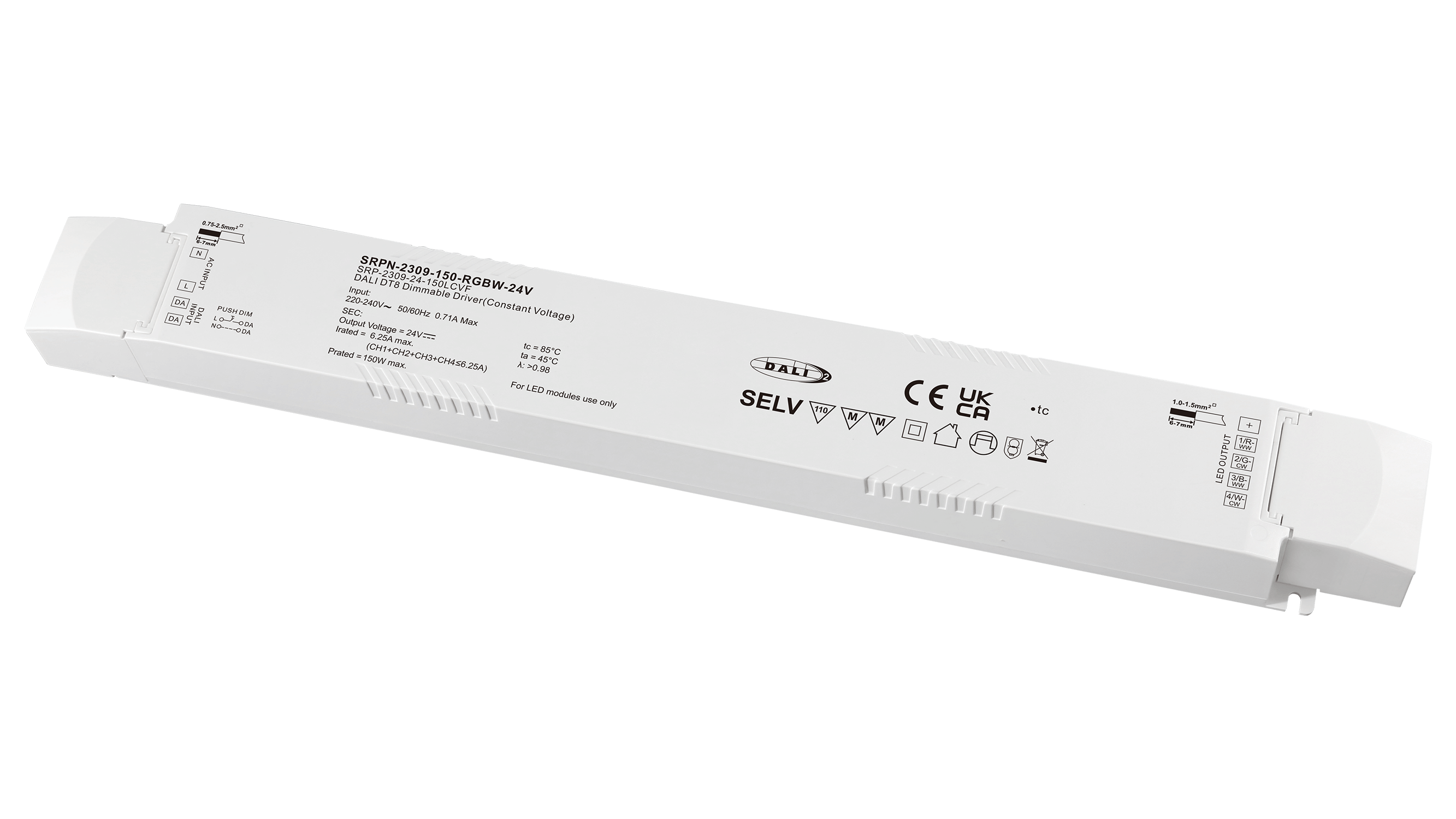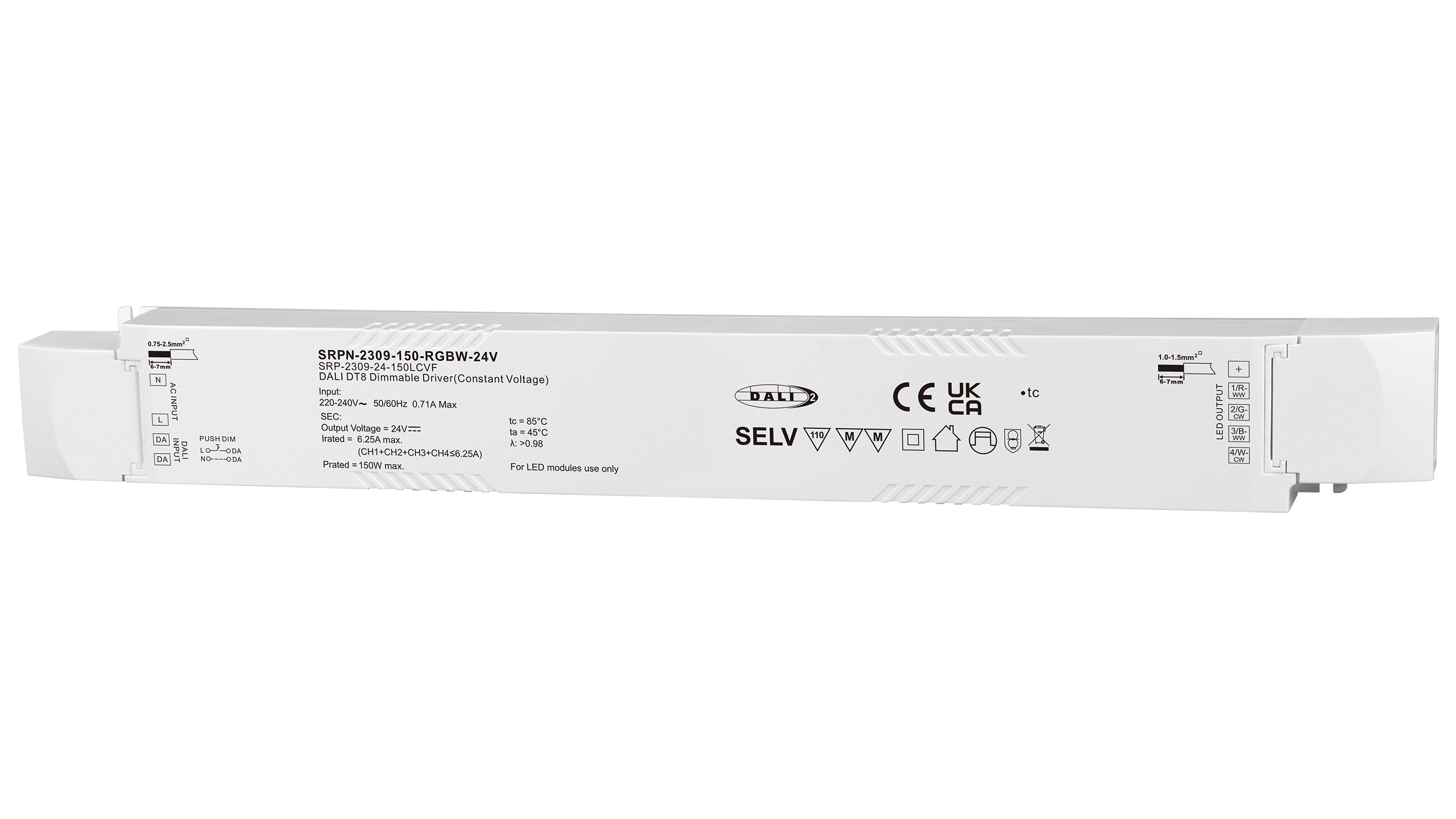 SRPN-2309-150-RGBW-24V 4 Kanal mit PWM Ausgang und integrierter DALI2 DT8 Schnittstelle ist ideal für den Betrieb von RGBW Konstantspannungs LED Anwendungen wie z.B. LED Streifen geeignet.