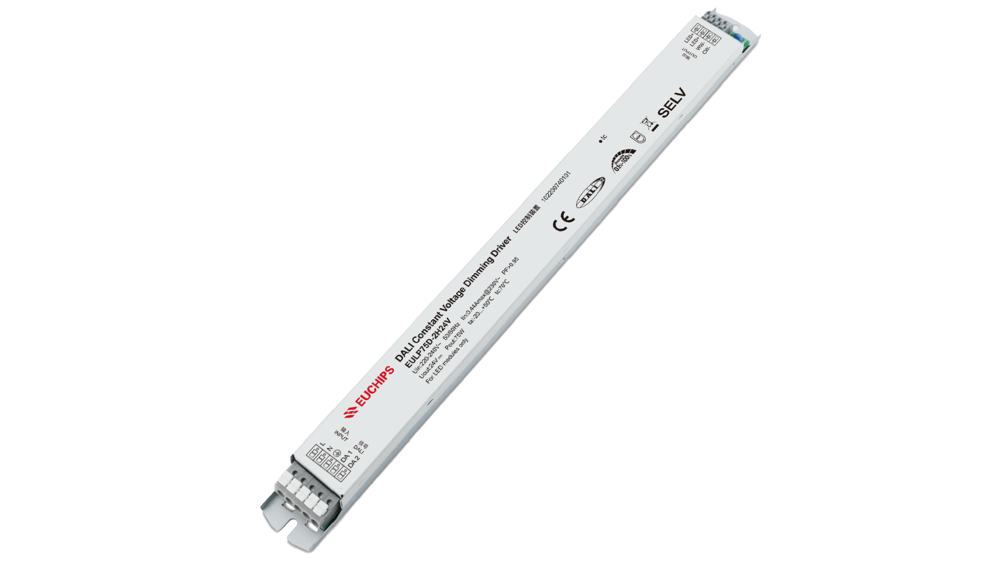 Der LED Treiber EULP75D-2H24V mit Konstantspannungsausgang ist ausgelegt für den Betrieb von 24Vdc Tunable White LED Beleuchtungsanwendungen. Der Treiber kann mit DALI2 und AC Push im Bereich von 0.1-100% gedimmt werden.