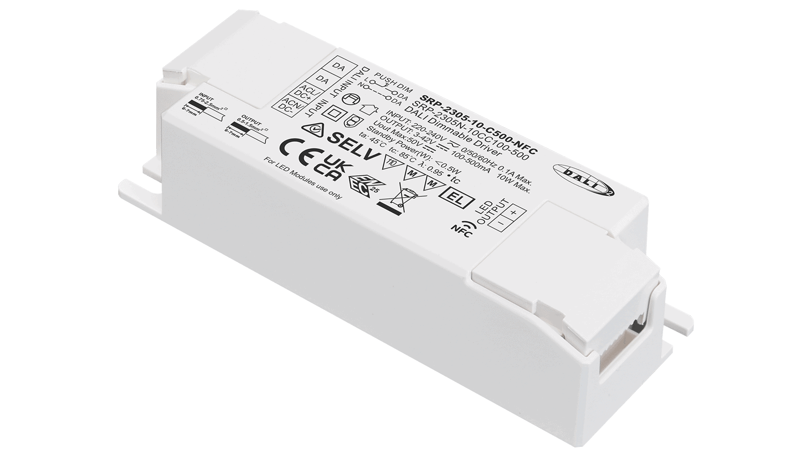 SRP-2305-10-C500-NFC ist ein flexibler, dimmbarer LED Konverter mit Konstantstromausgang. Das Netzteil kann mit DALI2 DT6 gesteuert werden. Der Ausgangsstrom kann via NFC zwischen 100 und 500mA eingestellt werden.
