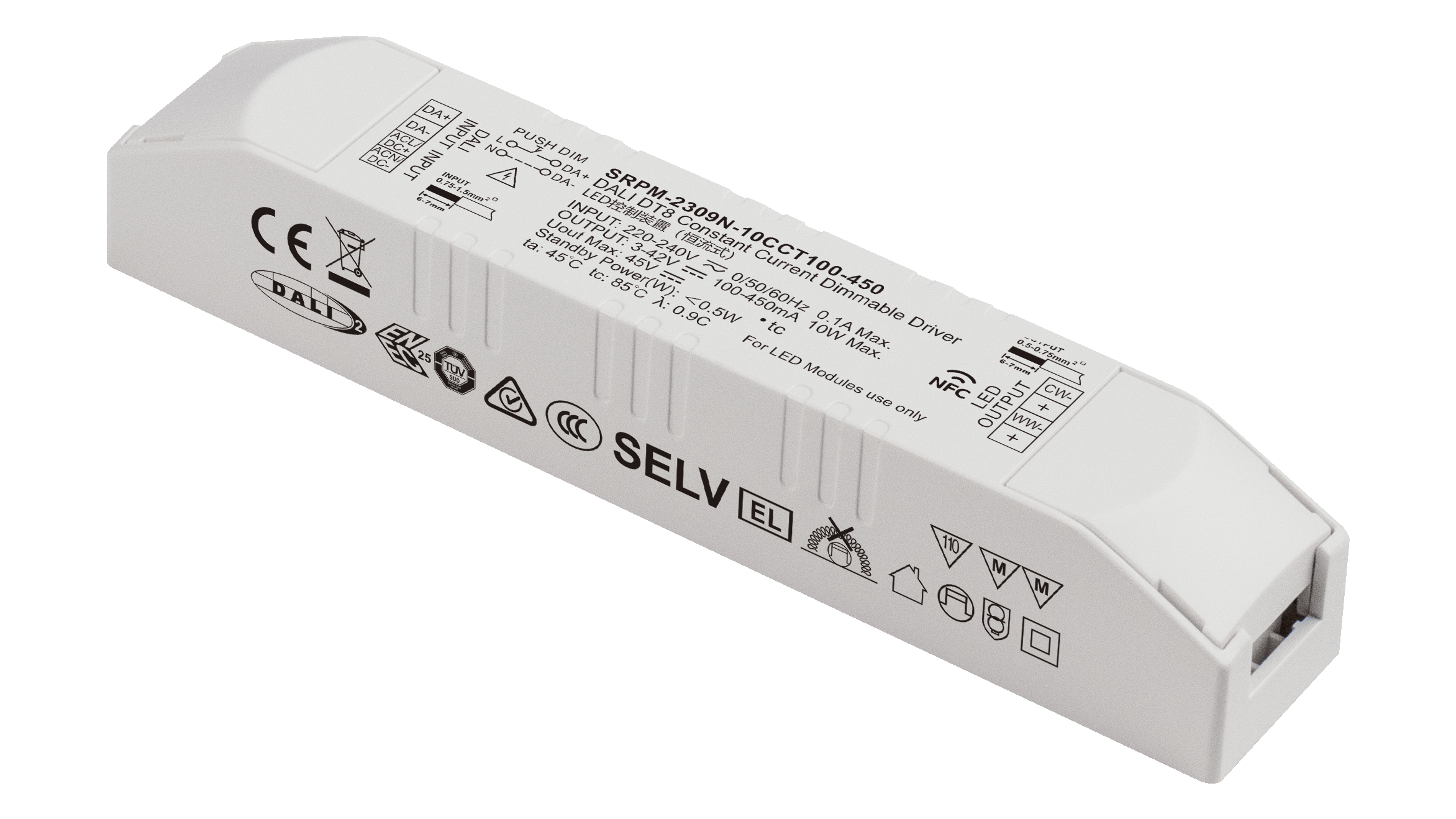 SRPM-2309N-10CC100-450 ist ein ultra schmaler, dimmbarer Tunable white LED Konverter mit Konstantstromausgang. Das Netzteil kann mit DALI2 DT8 gesteuert werden. Der Ausgangsstrom kann via NFC zwischen 100 und 450mA eingestellt werden.