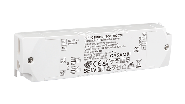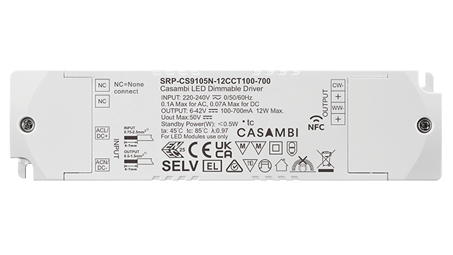 SRP-9105-12-TW-C700NFC ist ein flexibler, dimmbarer 12W Tunable white LED Konverter mit Konstantstromausgang. Das Netzteil kann mit Casambi gesteuert werden. Der Ausgangsstrom kann via NFC zwischen 100 und 700mA eingestellt werden.