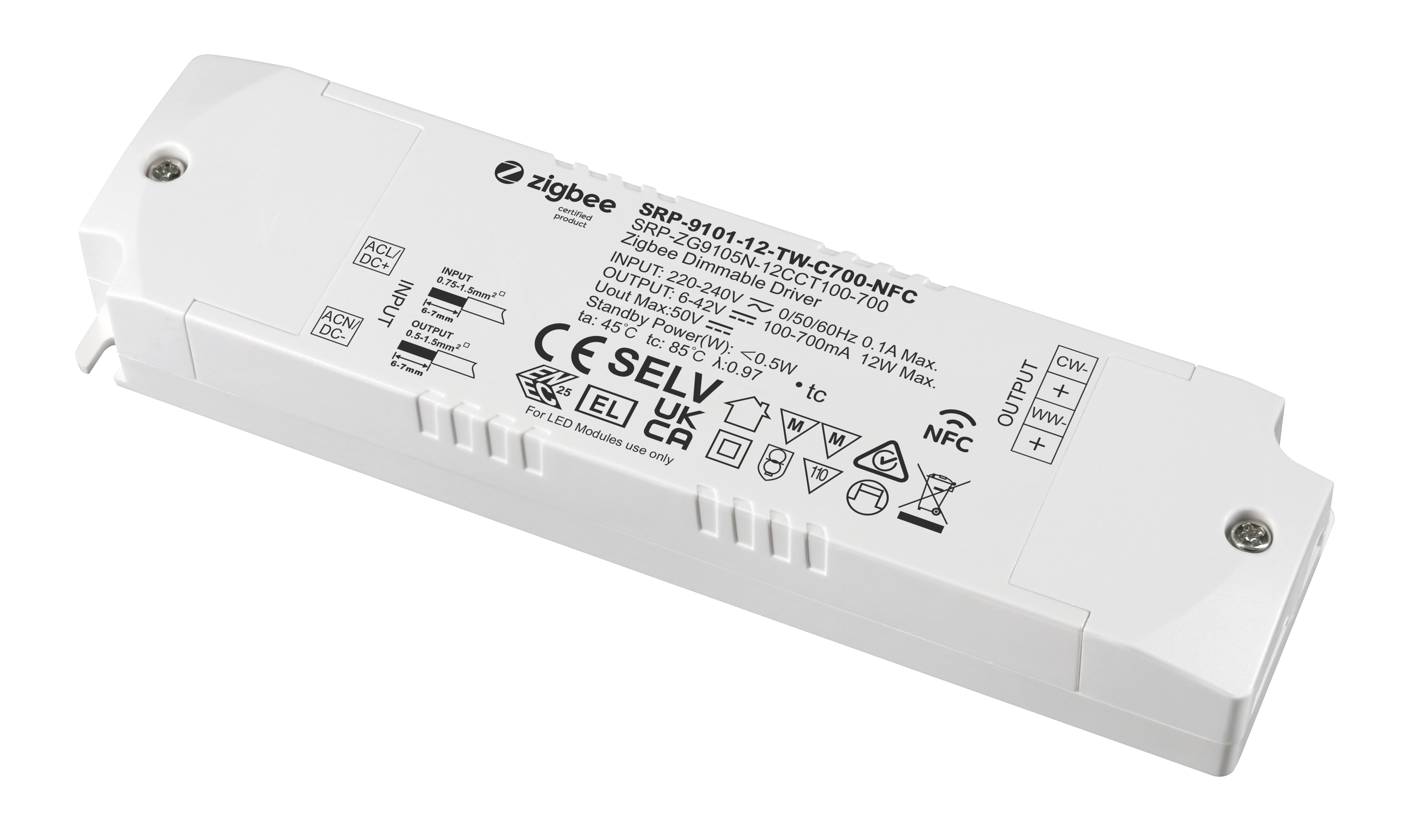 SRP-9101-12-TW-C700-NFC ist ein flexibler, dimmbarer 12W LED Konverter mit Konstantstromausgang. Das Netzteil kann mit ZigBee gesteuert werden und ist für Tunable White Anwendungen ausgelegt. Der Ausgangsstrom kann via NFC zwischen 100 und 700mA eingestellt werden.