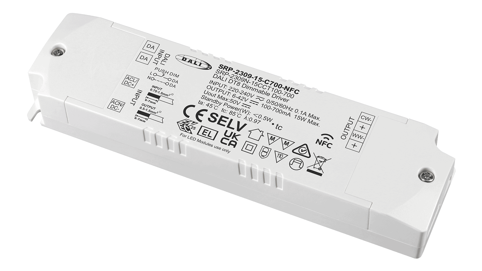 SRP-2309-15-C700-NFC ist ein flexibler, dimmbarer Tunable white LED Konverter mit Konstantstromausgang. Das Netzteil kann mit DALI2 DT8 gesteuert werden. Der Ausgangsstrom kann via NFC zwischen 100 und 700mA eingestellt werden.