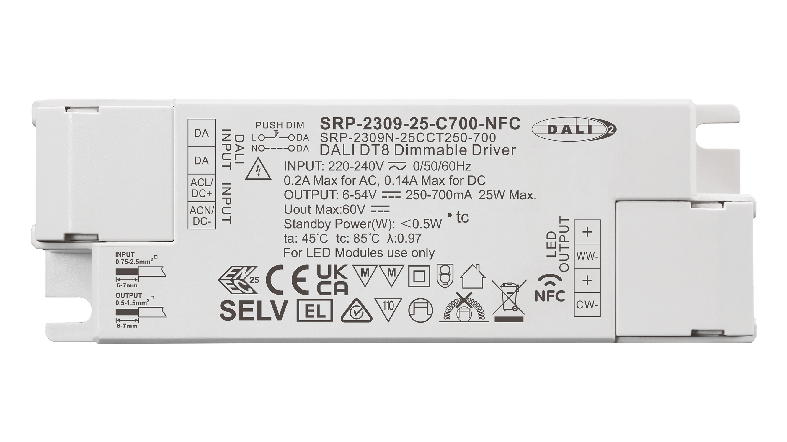 SRP-2309-25-C700-NFC ist ein flexibler, dimmbarer Tunable white LED Konverter mit Konstantstromausgang. Das Netzteil kann mit DALI2 DT8 gesteuert werden. Der Ausgangsstrom kann via NFC zwischen 250 und 700mA eingestellt werden.