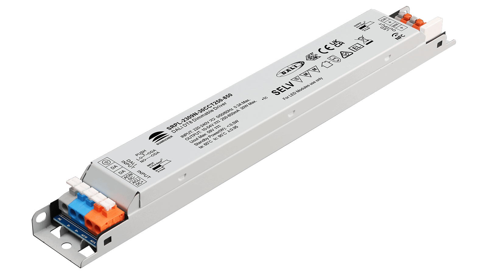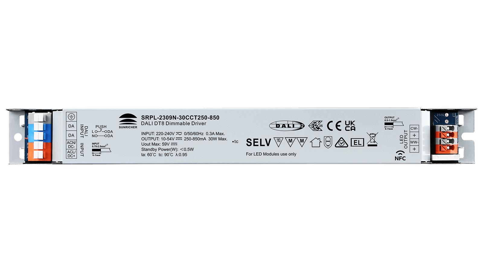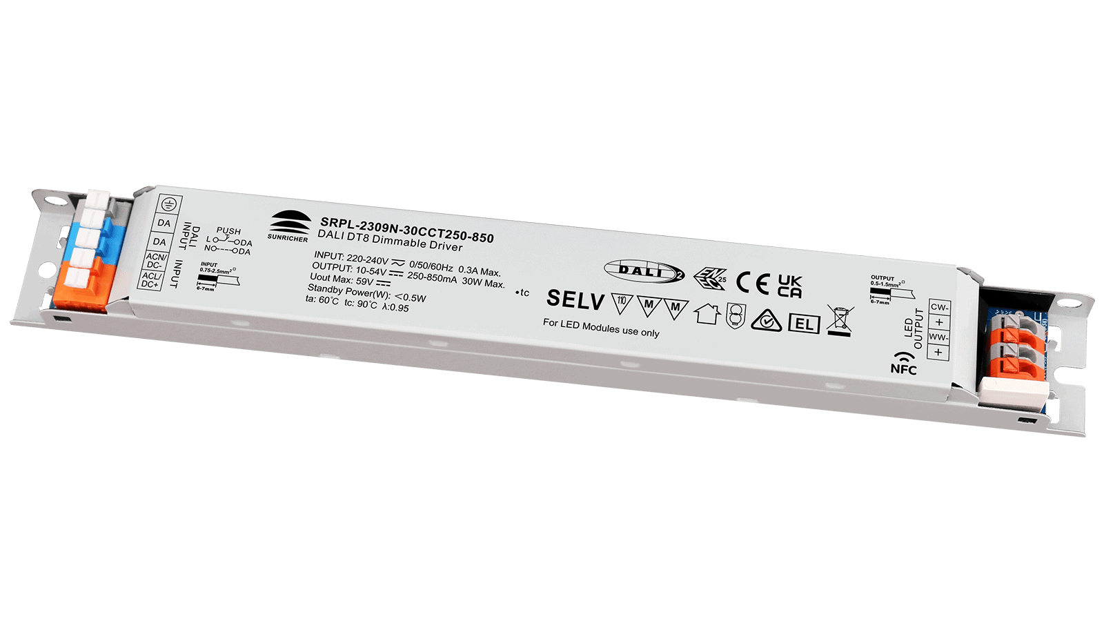 SRPL-2309N-30CCT250-850 ist ein flexibler, dimmbarer Tunable white LED Konverter mit Konstantstromausgang. Das Netzteil kann mit DALI2 DT8 gesteuert werden. Der Ausgangsstrom kann via NFC zwischen 250 und 850mA eingestellt werden.