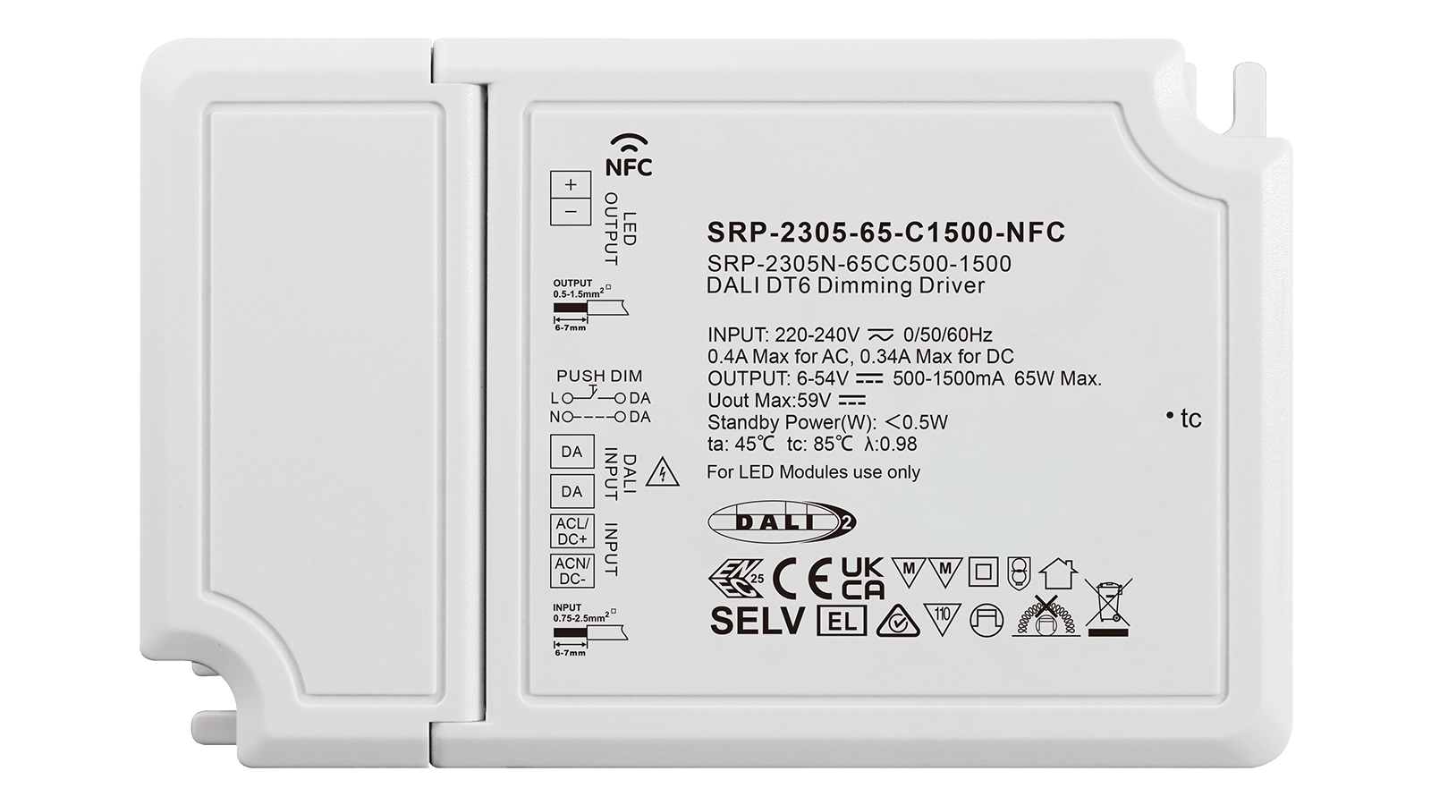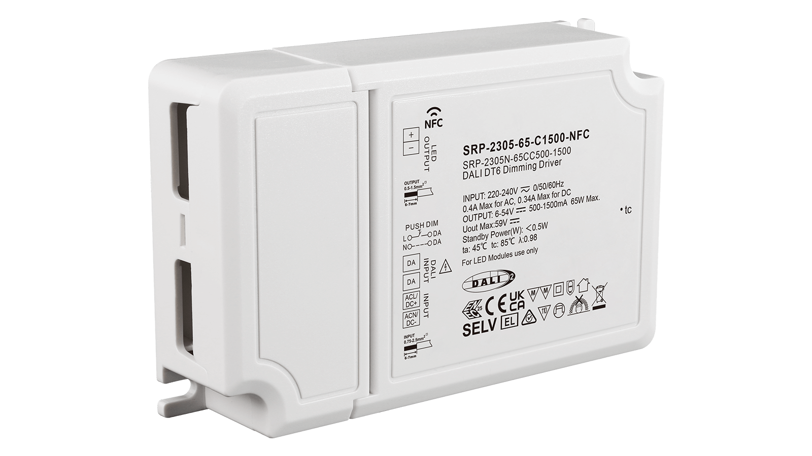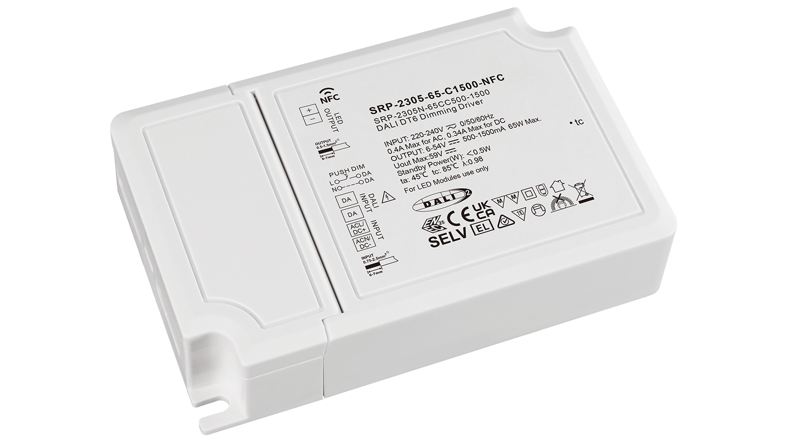 SRP-2305-65-C1500-NFC ist ein flexibler, dimmbarer LED Konverter mit Konstantstromausgang. Das Netzteil kann mit DALI2 DT6 gesteuert werden. Der Ausgangsstrom kann via NFC zwischen 500 und 1500mA eingestellt werden.