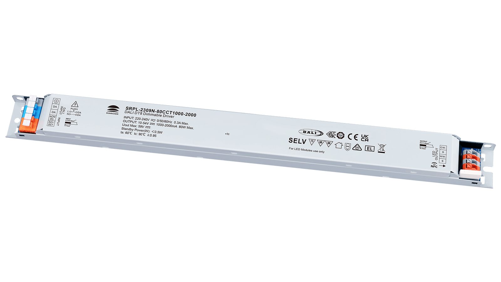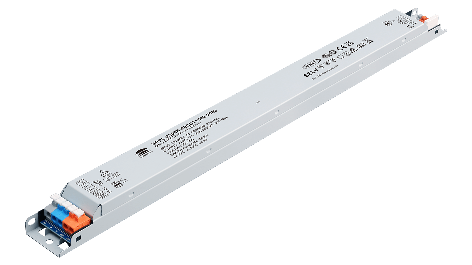 SRPL-2309N-80CCT1000-2000 ist ein flexibler, dimmbarer Tunable white LED Konverter mit Konstantstromausgang. Das Netzteil kann mit DALI2 DT8 gesteuert werden. Der Ausgangsstrom kann via NFC zwischen 1000 und 2000mA eingestellt werden.