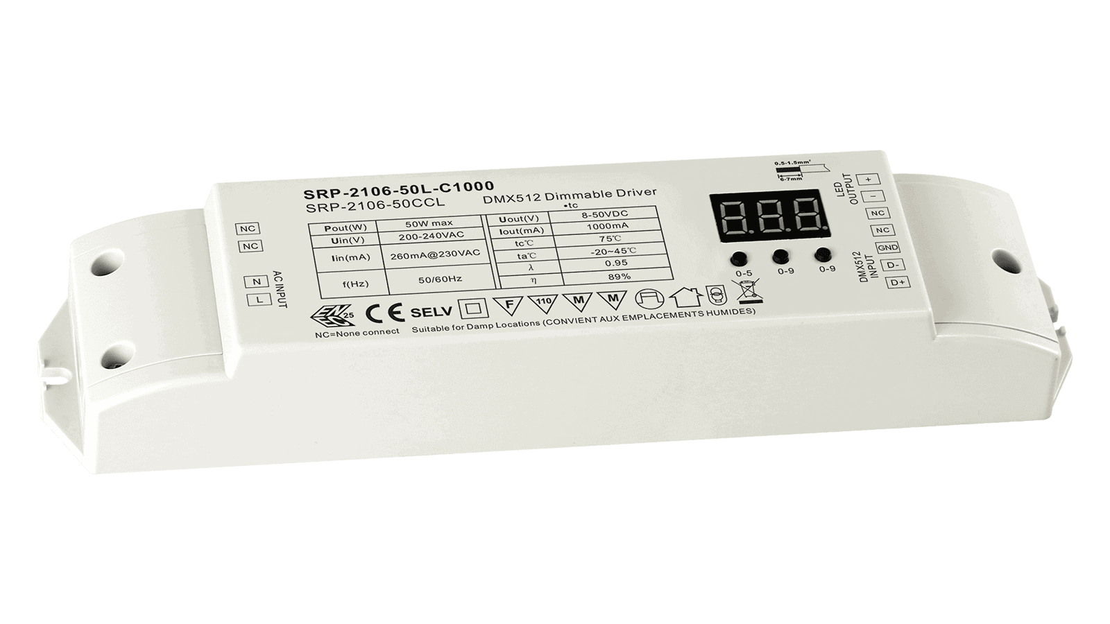 SRP-2106-50L-C1000 ist ein flexibler, dimmbarer LED Konverter mit Konstantstromausgang. Dieses Netzteil kann mit DMX512 gesteuert werden.
