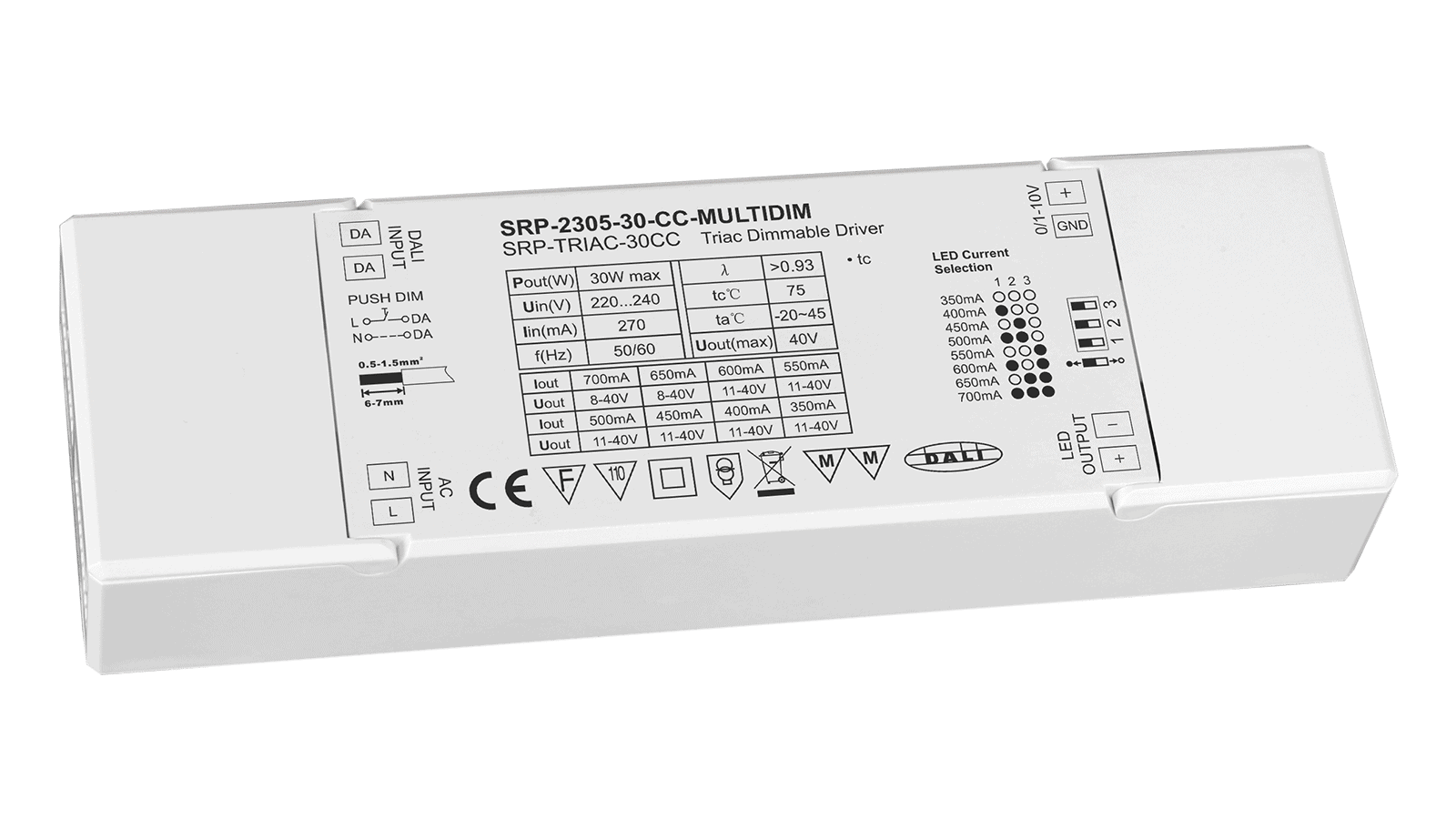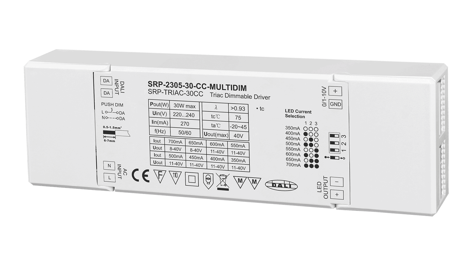 SRP-2305-30-CC-MULTIDIM ist ein flexibler, dimmbarer LED Konverter mit Konstantstromausgang. Dieses 4in1 Netzteil kann mit DALI, TRIAC, AC-Push etc. gesteuert werden.