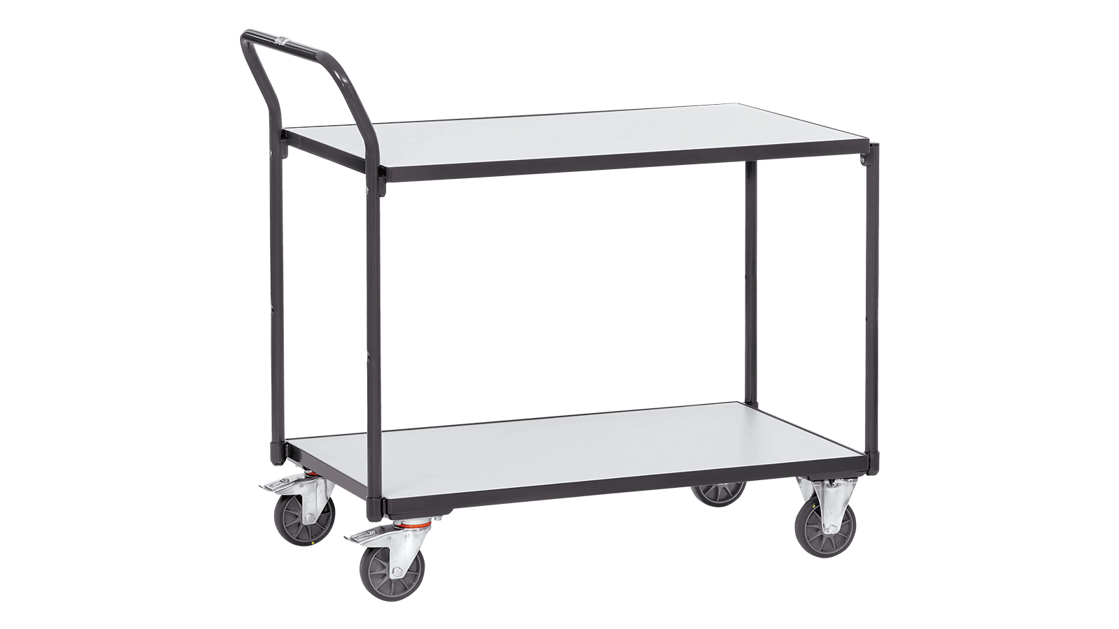 Elektrisch leitfähige Ausführung. Stahlrohr und Profilstahl geschweisst, elektrisch leitfähig pulverbeschichtet, schiefergrau RAL 7015. Schraub- und Steckkonstruktion. 2 Böden aus elektrisch leitfähiger Holzwerkstoffplatte nach DIN 68765, hellgrau, mit 5 mm hohem Rand. 2 Lenk- und 2 Bockrollen, Räder mit TPE-ESD-Bereifung (thermoplastisches Elastomer), elektrisch leitfähig, Naben mit Präzisions-Rillenkugellager. Höchster Komfort: Sehr geringer Anfahr-, Roll- und Schwenkwiderstand. Geräuscharmer Lauf auf ebenen Böden. Reifen nicht kreidend (spurlos). Feststeller an den Lenkrollen, gemäss der Europäischen Norm EN 1757-3 (Sicherheit von Plattformwagen). Tragkraft obere Ladefläche 80 kg. Gesamtlänge: 980 mm.