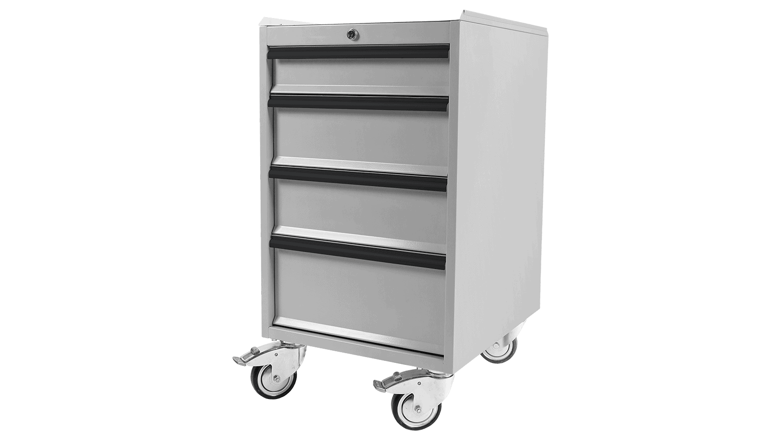 Ein Schubladensystem mit Arbeitsfläche auf 4 Rädern. Die Arbeitsfläche ist an drei Seiten mit einem Begrenzer ausgestattet. Zwei Räder mit Bremse. Vier Schubladen. Die Schubladen sind zentral durch ein Schloss abschliessbar.