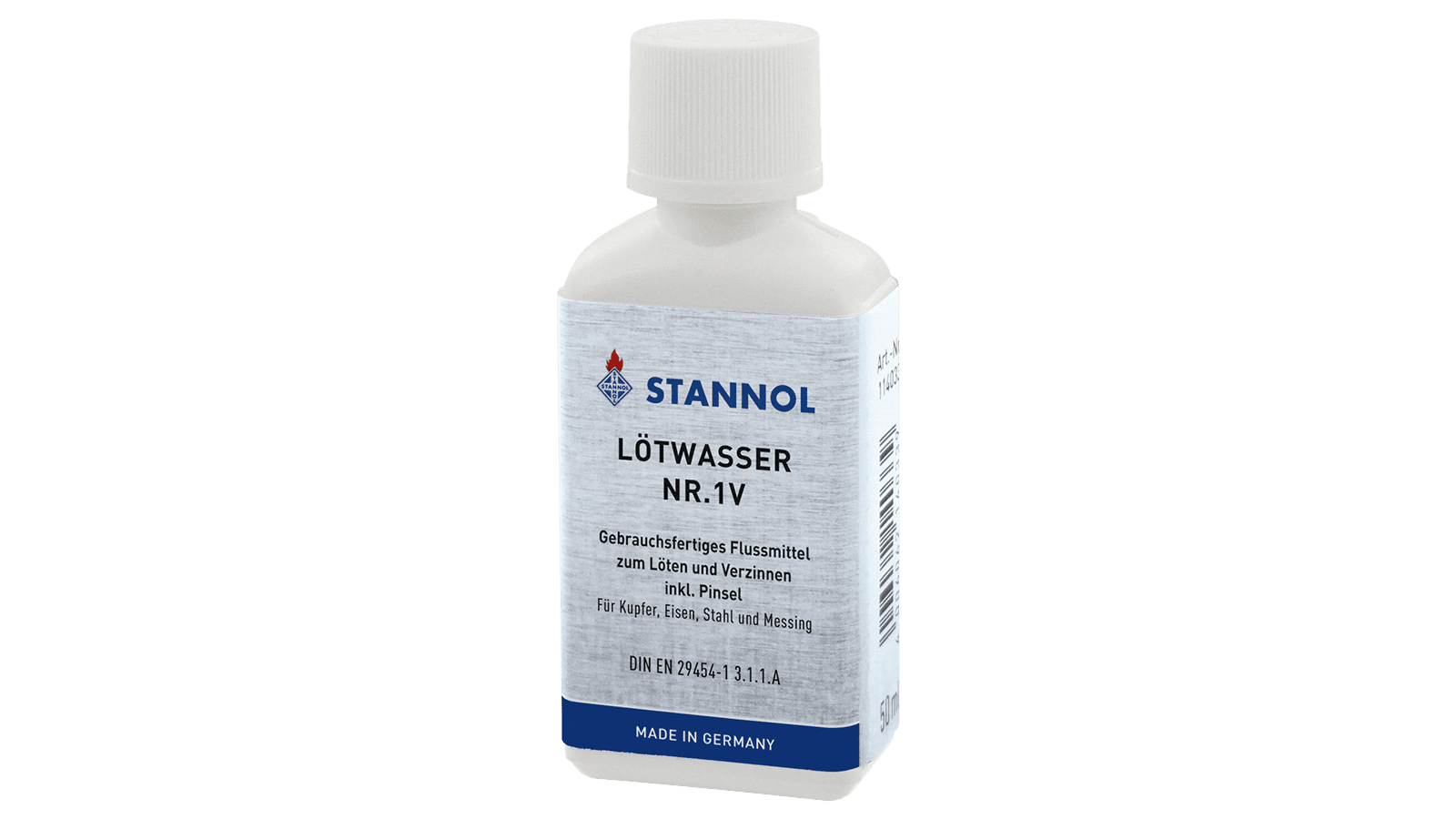 Aktiviertes anorganisches Flussmittel Typ 3.1.1 A nach DIN EN 29454-1 (DIN 8511 F-SW12). Stannol Lötwasser Nr. 1V ist ein aktiviertes anorganisches Flussmittel zum Löten und Verzinnen von Metallwaren aus Kupfer, Eisen, Stahl und Messing. Die Flussmittelrückstände wirken korrodierend. Sie sind wasserlöslich und können mit Wasser oder Waschlösung von glatten Oberflächen entfernt werden.