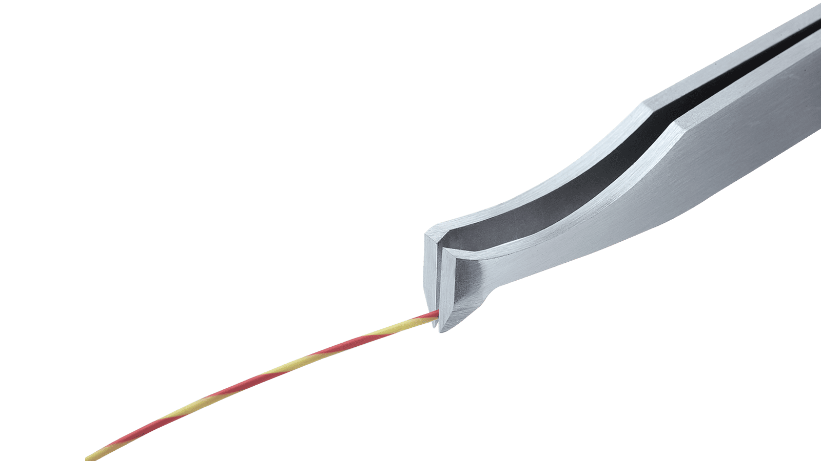 Schneidpinzette mit schmalem schrägem Kopf. Für weiche Drähte bis Ø 0,25 mm