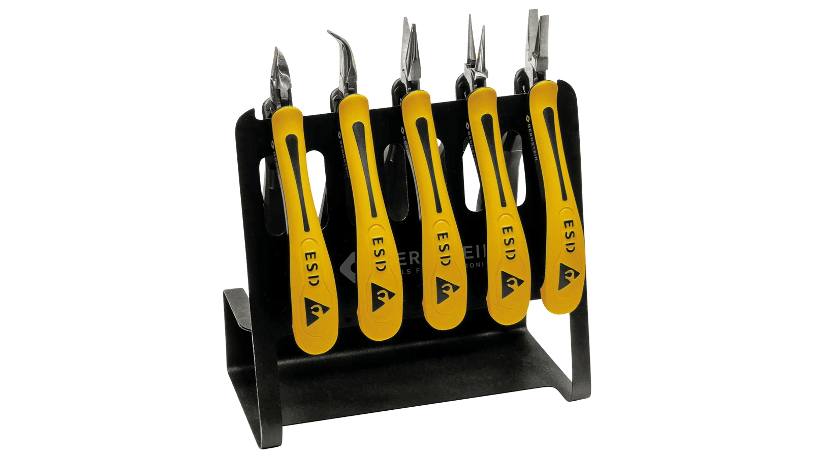 Hochwertiges ESD-Zangenset mit praktischem Werkzeughalter – ideal für den Einsatz in EPA-Bereichen. Sicher verstaut, übersichtlich sortiert und jederzeit einsatzbereit.