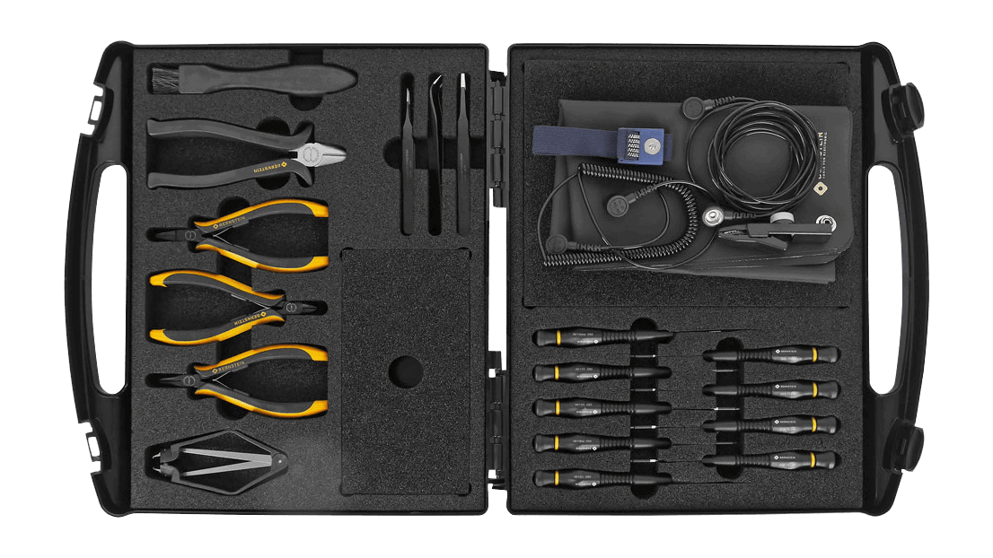 EPA geeignet für elektrostatisch geschützte Bereiche (ESD Arbeitsplatz/ESD Schutzzone). Profi-Werkzeugset für die Reparatur und Wartung komplexer elektronischer Bauteile und Baugruppen.