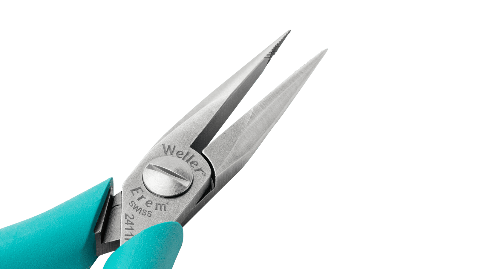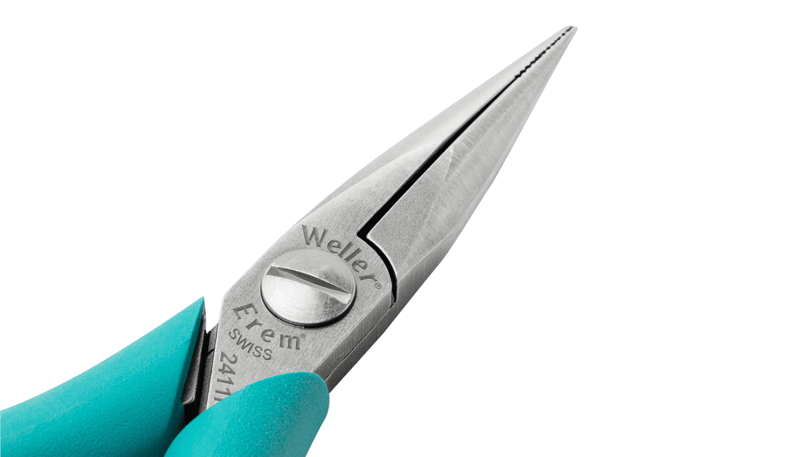 Die Weller Erem Serie 2400 MagicSense ist eine Serie mittelgroßer Präzisionsschneider, die Robustheit, Sichtbarkeit und Zugänglichkeit vereint. Eine große Auswahl an Kopfformen für Präzisionsarbeiten in schwer zugänglichen Bereichen. Die optimierte ergonomische Form der Serie 2400 MagicSense verhindert die Ermüdung der Hand. Für eine extrem hohe Lebensdauer werden diese Schneider aus optimierten, induktionsgehärteten Schneidkanten mit bis zu 64–65 HRc hergestellt. Für die Schneidkanten wird ein spezieller Werkzeugstahl verwendet. Die Präzisionsschneider haben eine nicht reflektierende Oberfläche, sind ESD-sicher und können nachgeschärft werden.