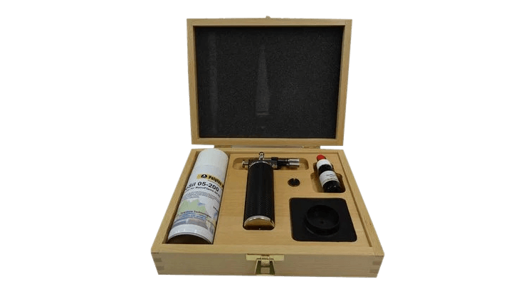 Das NanoFlame NF02-Set beinhaltet das Vorbehandlungsgerät NF02 mit einer 200 ml-Spezialgas-Nachfüllkartusche nebst Adapter und Testtinte. Das Set ist in einem repräsentativen Holzkästchen verpackt.