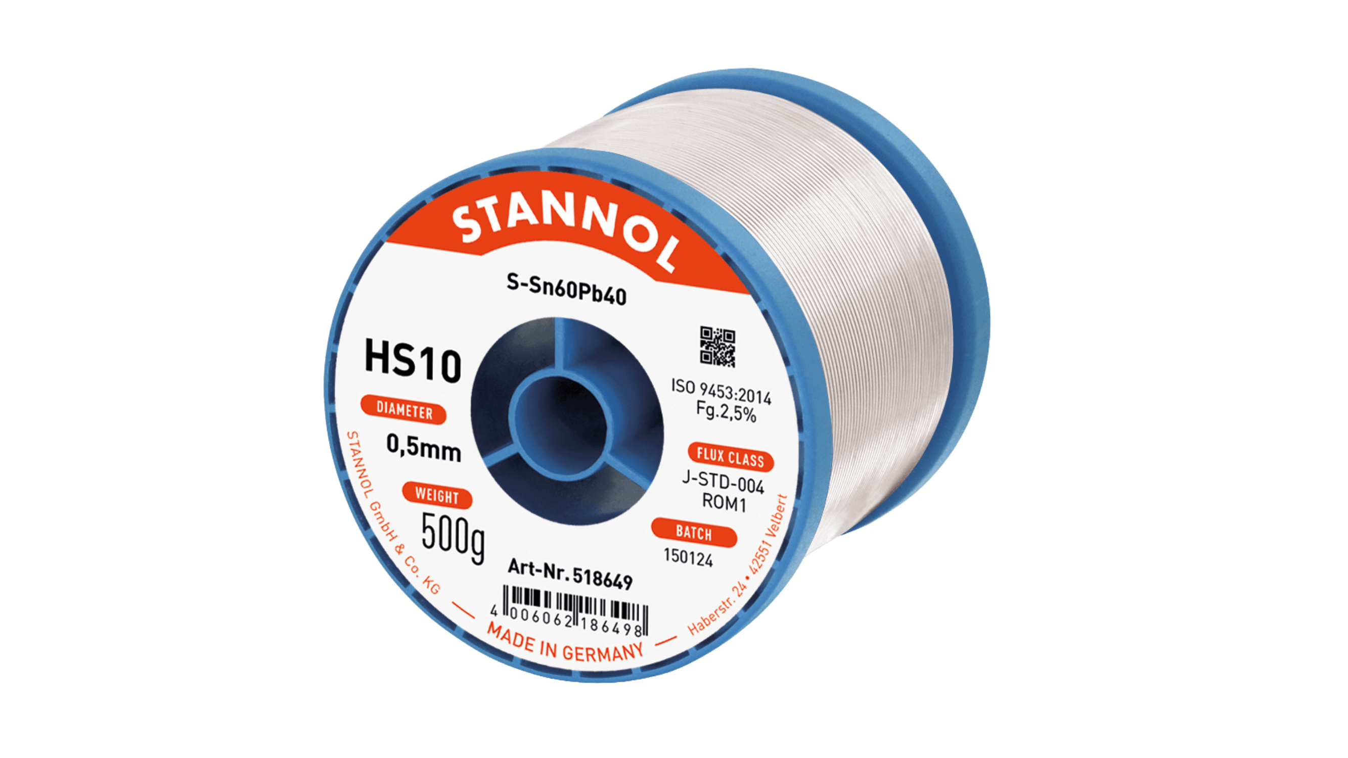 Der Elektroniklötdraht HS10 ist ein seit Jahren bewährtes Produkt unserer Forschung, welches für besonders hohe Qualitätsanforderungen in der industriellen Fertigung sowie für das schnelle Reparatur- und Nachlöten entwickelt wurde. Der Lötdraht HS10 zeichnet sich in hervorragender Weise durch hohe Aktivität, d.h. schnelle Ausbreitung und elektrisch sichere Rückstände aus. Das Drahtflussmittel HS10 besteht aus halogenaktiviertem Naturharz (Kolophonium) und entspricht nach J-STD-004 Typ ROM1.