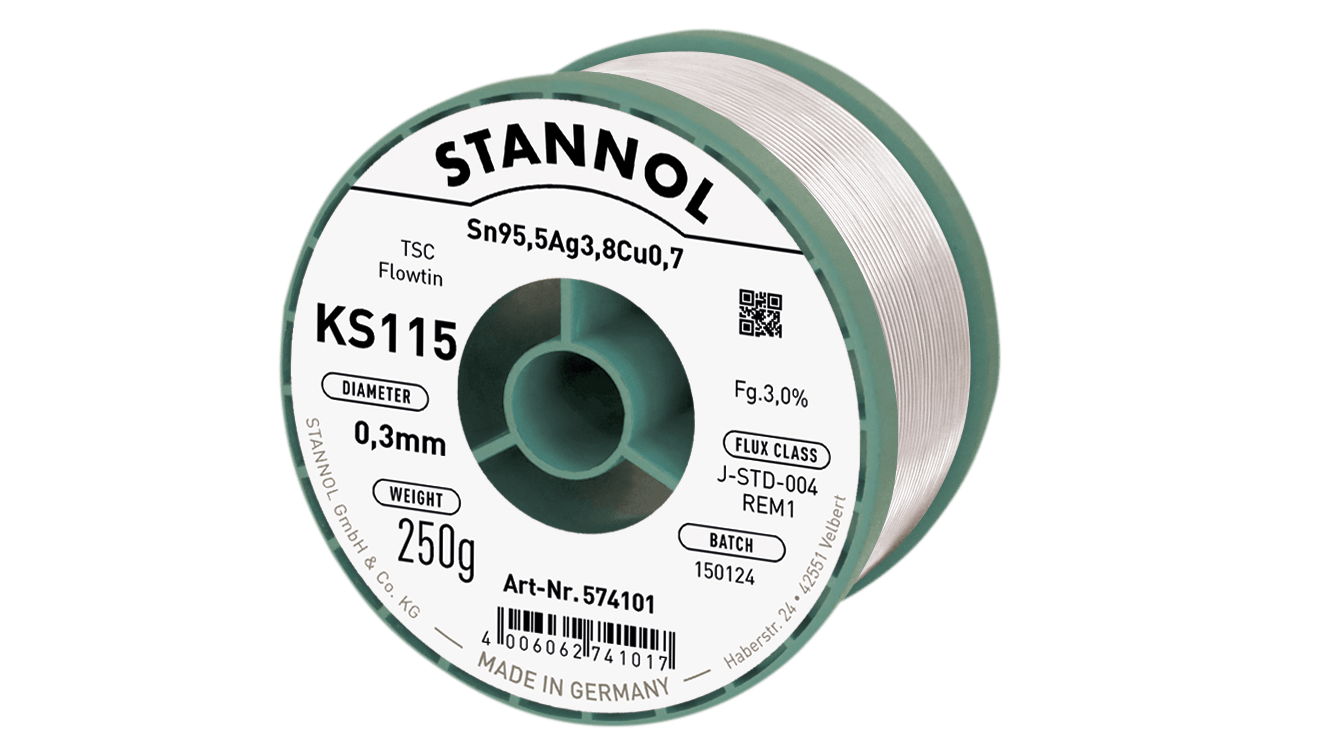 Stannol KS115 enthält ein halogenaktiviertes und Kolophonium freies Flussmittel mit synthetischen Harzen. Der Stannol KS100 basiert auf den gleichen Harzen, ist jedoch halogenfrei aktiviert. Alle Flussmitteltypen kombinieren in hervorragender Weise hohe Aktivität und thermische Belastbarkeit mit hellen, harzigen, festen und elektrisch sicheren Rückständen. Das Stannol Drahtflussmittel KS115 entspricht J-STD-004. Durch die hohe Aktivierung (1,5%) wird das Drahtflussmittel in die Klasse REM1 eingestuft. Der Stannol KS100 entspricht nach J-STD-004 Typ REL0