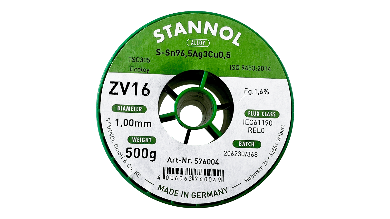 Stannol Lötdraht ZV16 ist ein flussmittelgefüllter No-Clean-Elektroniklötdraht. Das Flussmittelsystem ZV16 ist halogenidund halogenfrei. Es basiert auf chemisch modifizierten Harzen, beinhaltet also kein natürliches Kolophonium und hinterlässt weiche abbürstbare Rückstande. Das Flussmittel ist sehr aktiv, sodass der Lötdraht lediglich einen geringen Flussmittelgehalt benötigt.