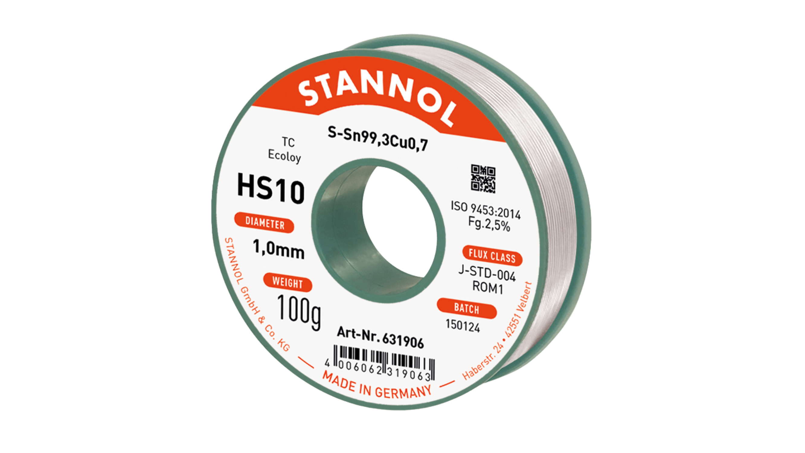 Der Lötdraht HS10 kann für Hand- und Roboterlötung im Bereich der Elektrotechnik und Elektronik eingesetzt werden. Die Flussmittelrückstände können auf den Lötstellen verbleiben. Muss aus optischen oder technischen Gründen gereinigt werden, kann dies wirkungsvoll mit den Reinigungsmedien Stannol Flux-Ex 200B oder Stannol Flux-Ex 500 durchgeführt werden.