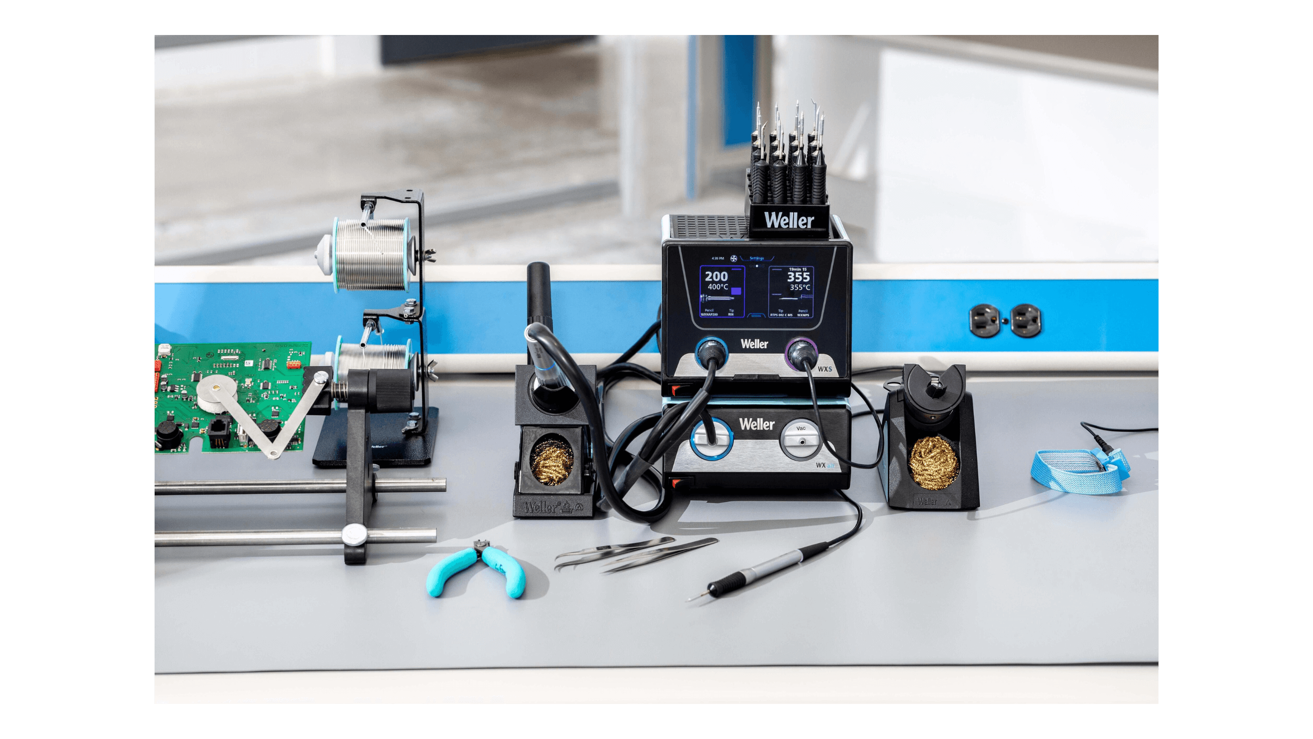 Rework Set WXS 2020 für jeden Verwendungszweck. Ein neues Löt-Set. Rework-System mit WXsmart Station und WXair Modul für anspruchsvollste Aufgaben in der Elektronik-, Medizin-, Luftfahrt- und Automobilindustrie. Es bietet kürzeste Aufheiz- und Erholzeiten sowie eine vollständige Prozesskontrolle von der Spitze bis zur Station mit den neuen intelligenten Werkzeugen. Erstklassige Konnektivität, ein benutzerfreundlicher Farb-Touchscreen und Cyber-Sicherheit runden das Paket ab. In Kombination mit dem Modul WXair wird die WXsmart Station zu einer kompletten Rework-Station.