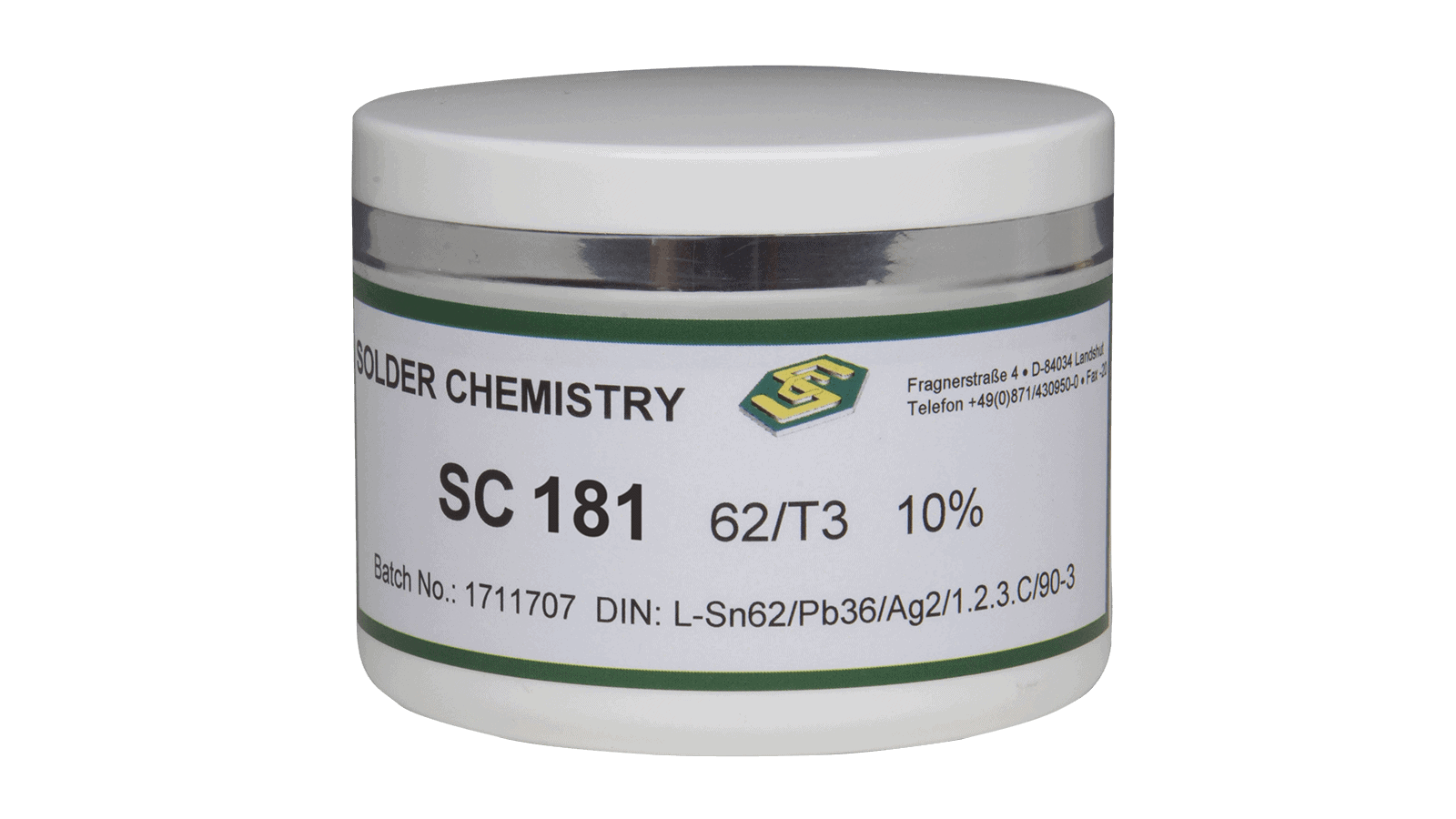 Die Lotpaste SOLDER CHEMISTRY SC 181 ist ein spitzen High-Tech-Produkt, das für die aller- neuesten SMT-Anwendungen bestens geeignet ist. Langjährige Erfahrung auf dem SMT-Gebiet und fundierte Kenntnisse in der Kunststoffchemie haben zu einer vollständigen und zukunftsweisenden Entwicklung beigetragen. Die SC 181 ist, wie alle SMT-Lotpasten, eine gleichmäßige Mischung aus einem Weichlotpulver, in allen erforderlichen Legierungen und Körnungen lieferbar, mit einem organischen Bindemittel auf synthetischer Harzbasis, das der RE L0 nach J-STD-004 oder ISO 1.2.3.C entspricht; absolut halogenfrei(!) und dadurch zu den neuesten und allerbesten “no-clean”-Pastentypen gehört. Die SC 181 stellt eine konsequente Weiterentwicklung der SC 180, optimiert auf verlängerte Wartezeiten zwischen Drucken und Bestücken, dar.