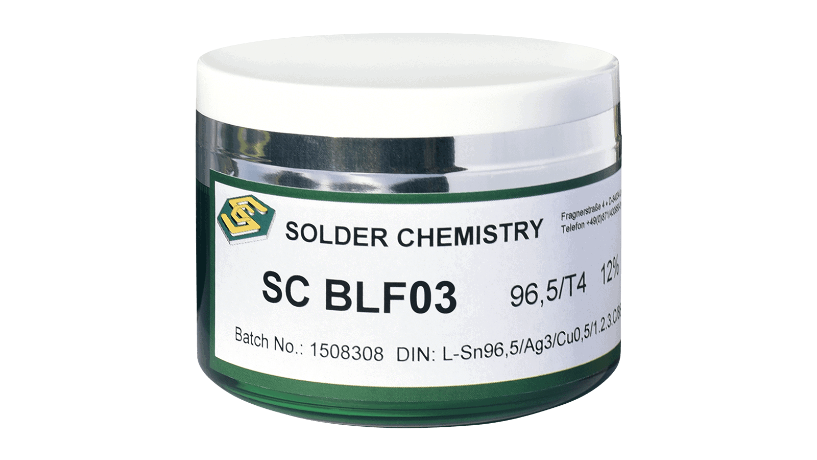 Die SC BLF03 ist ein konsequent weiterentwickeltes High-Tech-Produkt, das für alle sogenannten bleifreien SMT-Anwendungen bestens geeignet ist. Ihrer Entwicklung liegen nicht nur langjährige Erfahrungen auf dem SMT-Gebiet, sondern auch die sorgfältige und strenge Beachtung der Richtlinien von ISO-, EN-, IPC-, und MIL-Normen zugrunde. Die SC BLF03 ist physikalisch gesehen eine gleichmäßige Mischung aus einem bleifreien Weichlotpulver, in allen erforderlichen Legierungen und Körnungen lieferbar, mit einem organischen Bindemittel auf Kunstharzbasis, das der RE L0 nach J-STD 004 (F-SW32) entspricht (übertrifft die RMA-Anforderungen!). Dadurch gehört sie zu den allerbesten “no-clean”-Pastentypen.