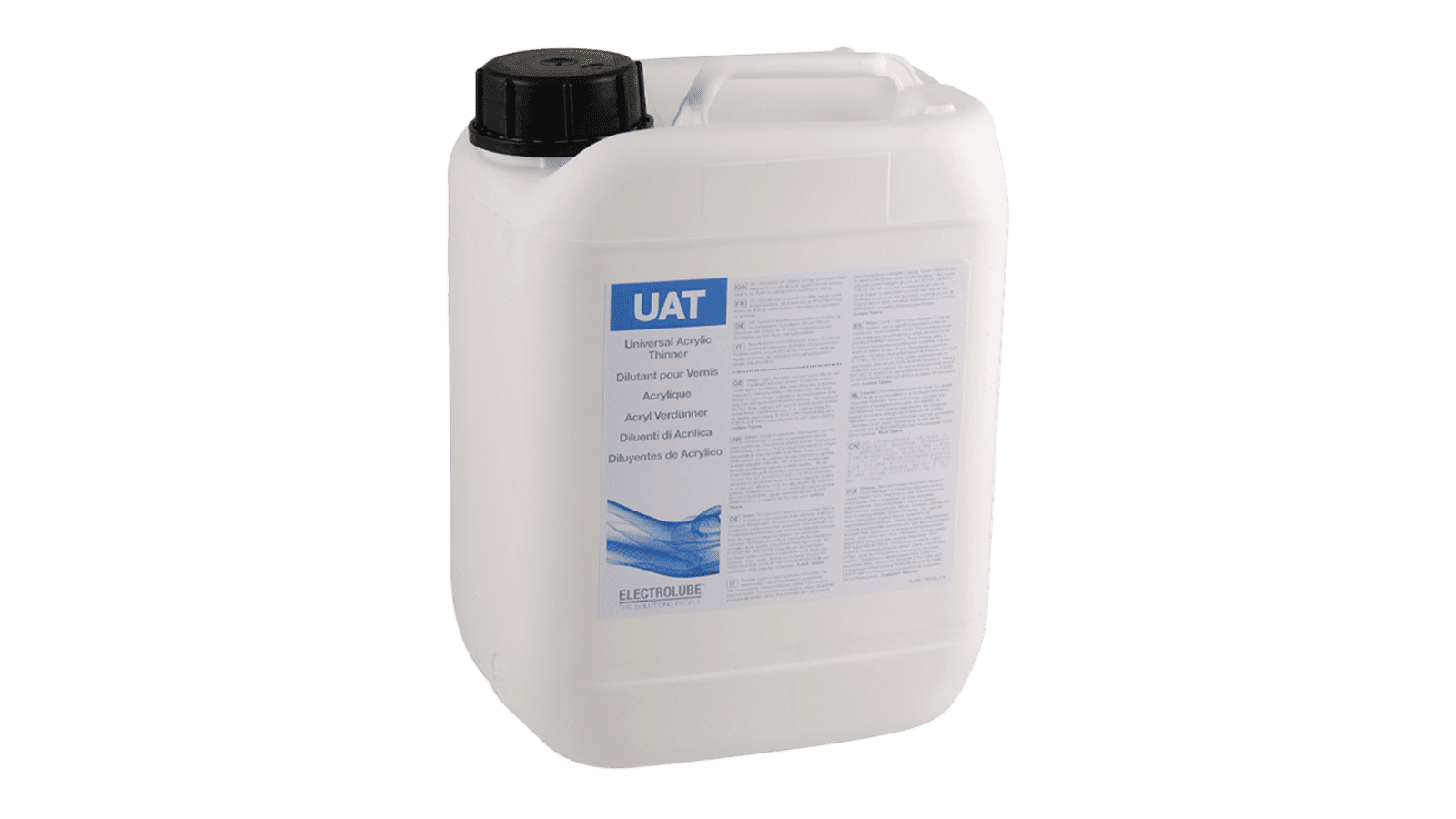UAT ist eine hochreine Lösungsmittelmischung, die für die Verwendung mit allen auf Acryl basierten Schutzlacken von Electrolube entwickelt wurde. Electrolube Schutzlacke, die für die Verwendung mit UAT geeignet sind: