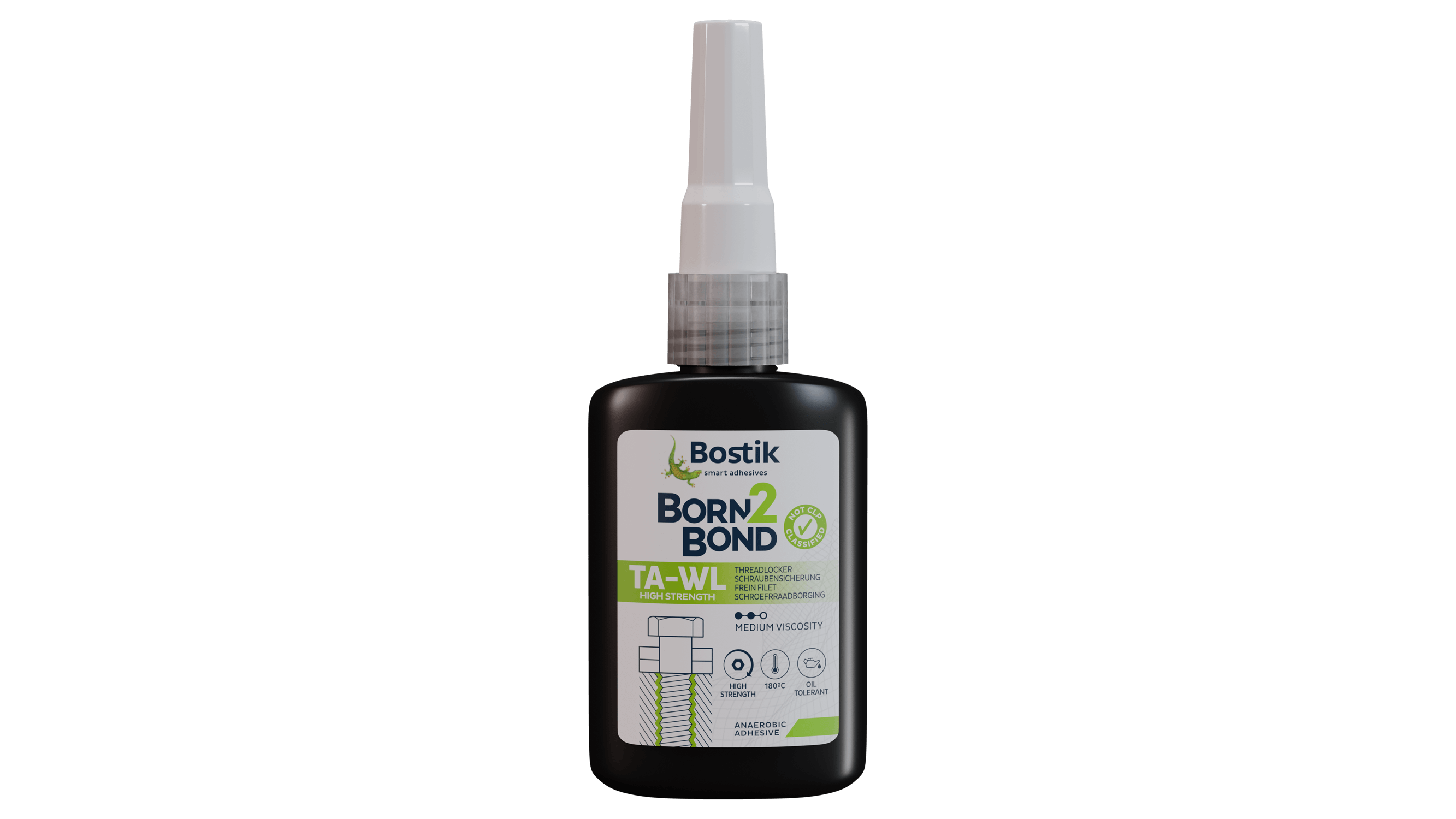 Bostik Born2Bond™ TA-WL High Strength ist ein grüner, flüssiger, anaerober Klebstoff zum Sichern und Abdichten von Schrauben mit Gewinden. Er hat eine hohe Festigkeit, mittlere Viskosität und ist speziell für eine verbesserte Arbeitsumgebung entwickelt und nicht CLP klassifiziert. Nach dem Aushärten verhindert er ein Auslaufen oder Lösen von Teilen durch Vibrationen und Stöße.