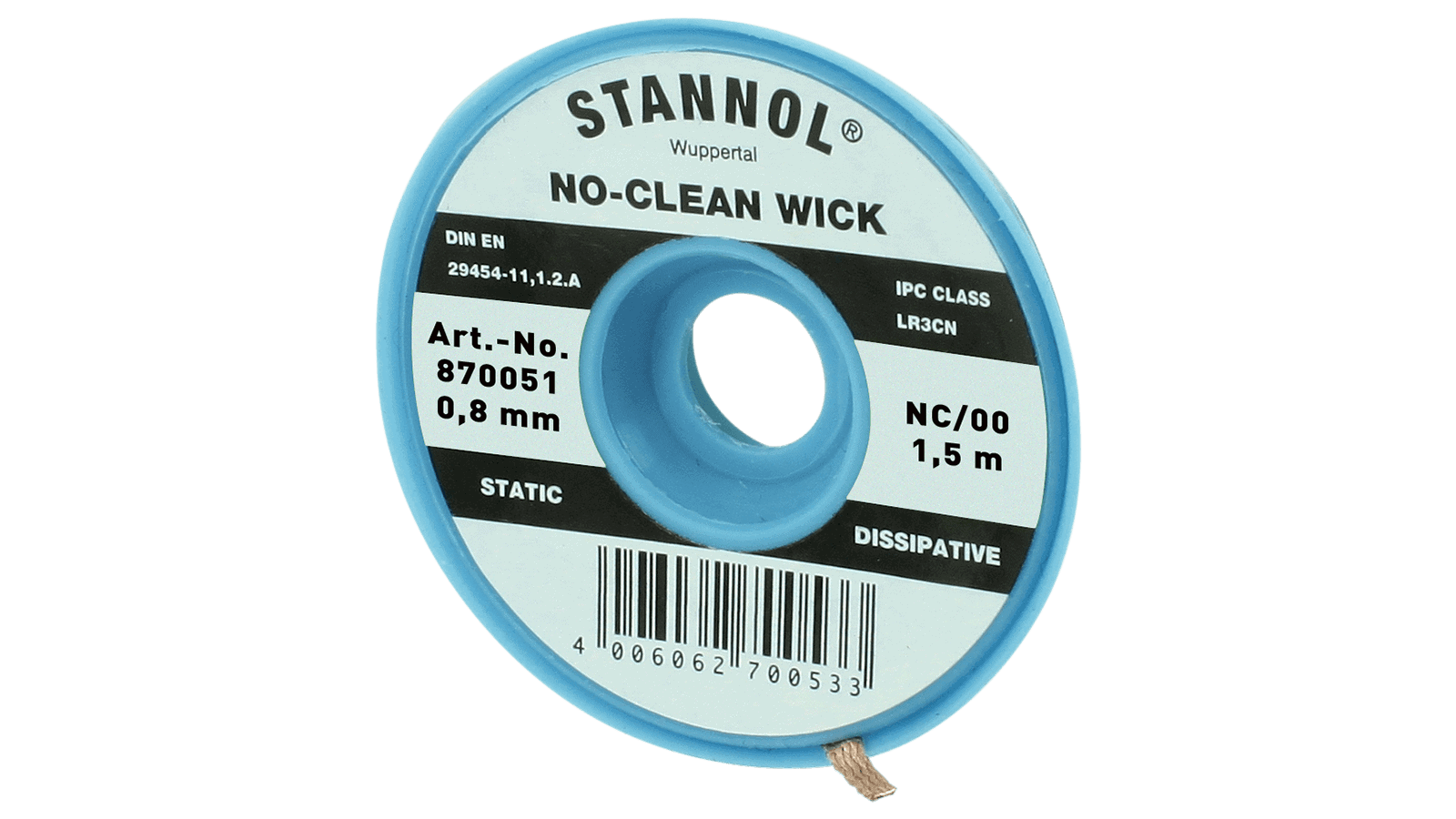 Die No-Clean Entlötlitze ist für das sichere Entlöten und die Reparatur von Lötstellen entwickelt worden, ohne dass nachträglich gereinigt werden muss. Die No-Clean Entlötlitze ist mit einem speziellen halogenfreien No-Clean-Flussmittel beschichtet, welches die Aufsauggeschwindigkeit bei der Lotaufnahme beschleunigt. Die Lagerung in feuchter Umgebung beeinträchtigt diese Eigenschaft nicht. Die Litze bleibt flexibel und oxidiert nicht.