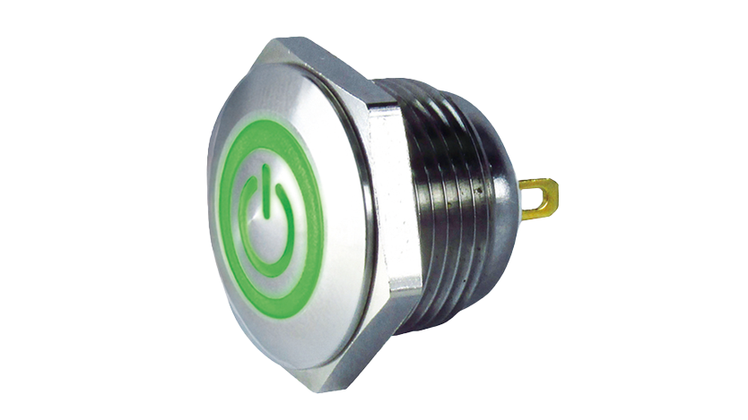 Druckschalter mit Power Aufdruck und grüner LED Beleuchtung.