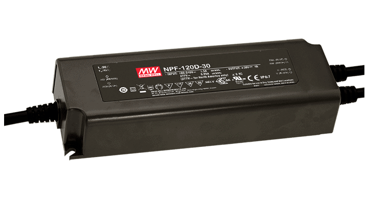 NPF-120D ist ein dimmbarer 120W LED Konverter im Kunststoffgehäuse mit IP67 Schutzklasse für Innen- und Aussenanwendungen ohne direkte Sonneneinstrahlung.