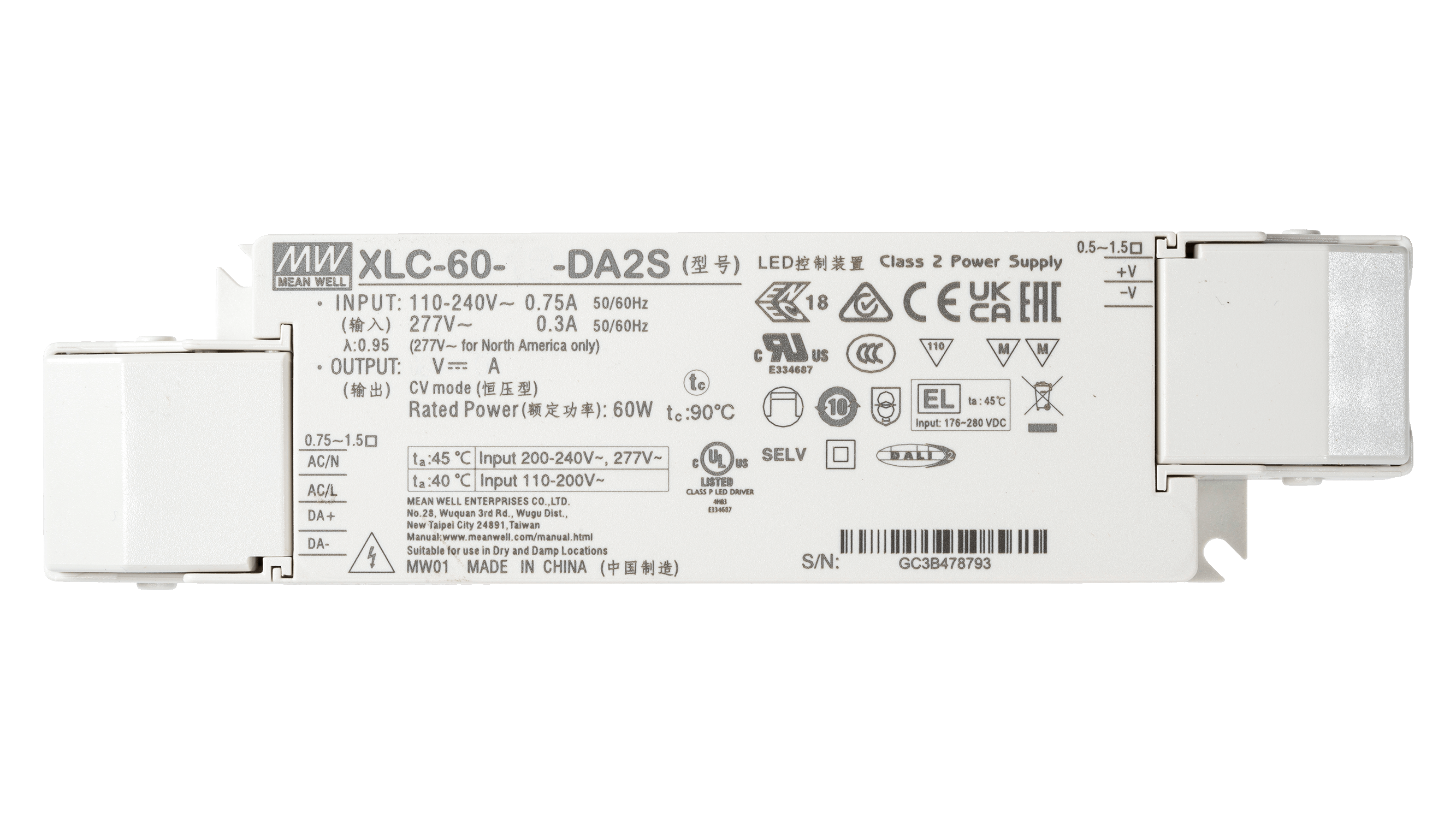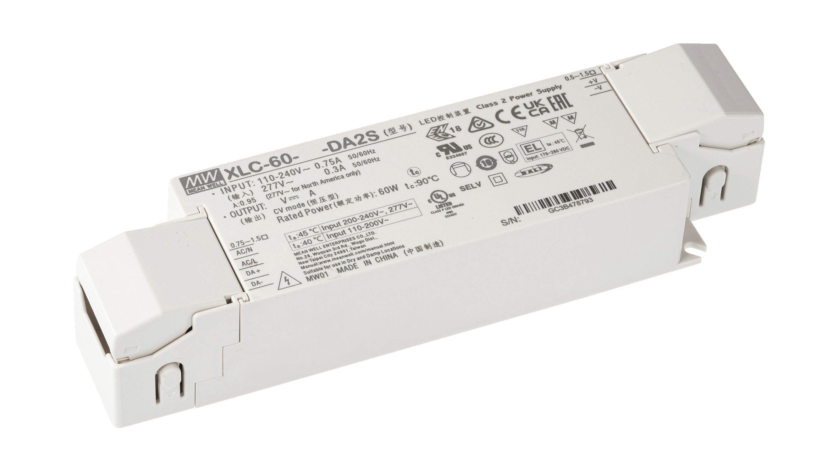 XLC-60-24-DA2 ist ein flexibler LED Treiber für 24Vdc LED Anwendungen. Über AC Push oder DALI dimmbar.