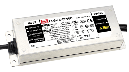 MEAN WELL ELG-75-CxxB-3Y ist ein LED Treiber für den Einsatz als Konstantstromquelle. Version mit Erdanschluss am Kabel, mit 3in1 Dimming Funktion (dim-to-off).
