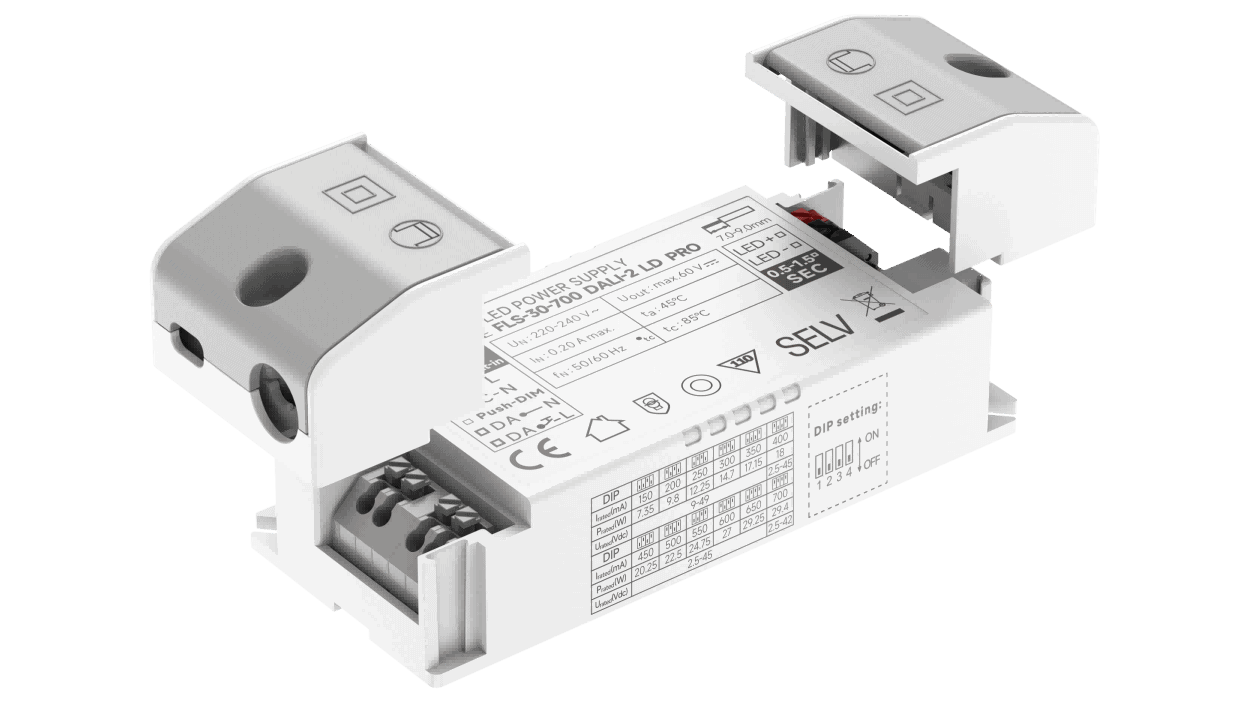 Der LED Treiber FLS-30-700 DALI2 LD PRO mit Konstantstromausgang ist ausgelegt für den Betrieb von LED Beleuchtungsanwendungen von 150 bis 700mA im Spannungsbereich von 2.5 bis 49Vdc. Der Ausgangsstrom kann per DIP Switch am Gerät eingestellt werden. Für den Betrieb innerhalb der Leuchte können die Side Covers abmontiert werden. Der Treiber kann mit DALI2 und AC Push im Bereich von 1-100% gedimmt werden.