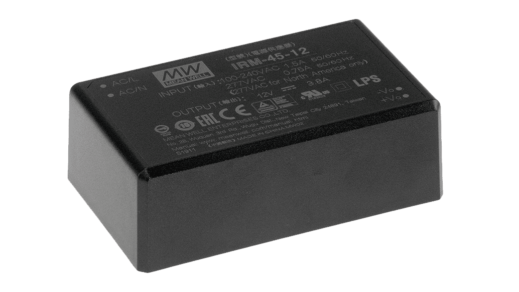 IRM-45-5 ist ein kompaktes 45W AC/DC Netzteil für die direkte Montage auf die Leiterplatte.