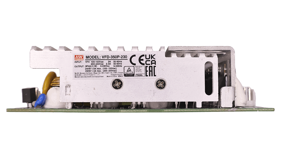 VFD-350P-230 ist ein Motortreiber mit variabler Frequenz, der mit einem externen PWM-Regler gesteuert werden kann. Der Eingangsbereich reicht von 90Vac bis 264Vac und ist für alle Arten von Installationen geeignet. Der VFD eignet sich für dreiphasige Motorantriebe, wie BLDC, Induktionsmotoren und SNRM-Anwendungen.